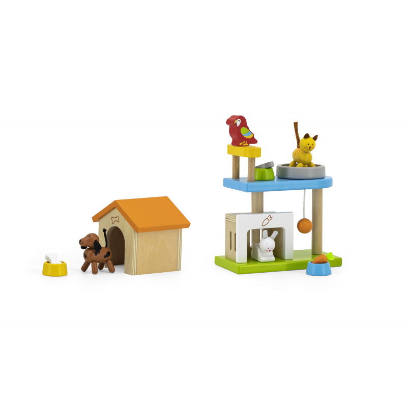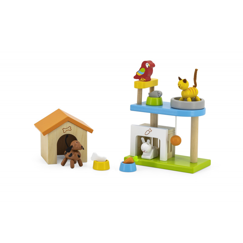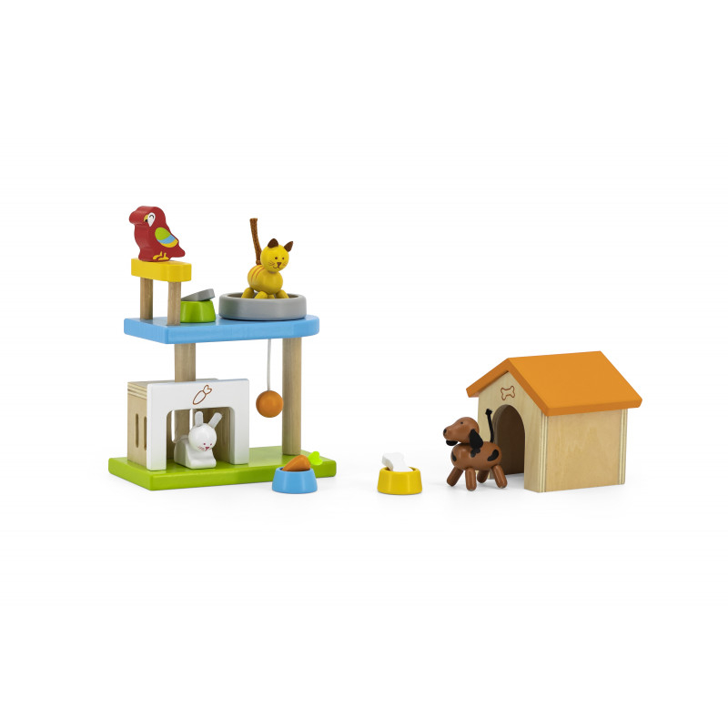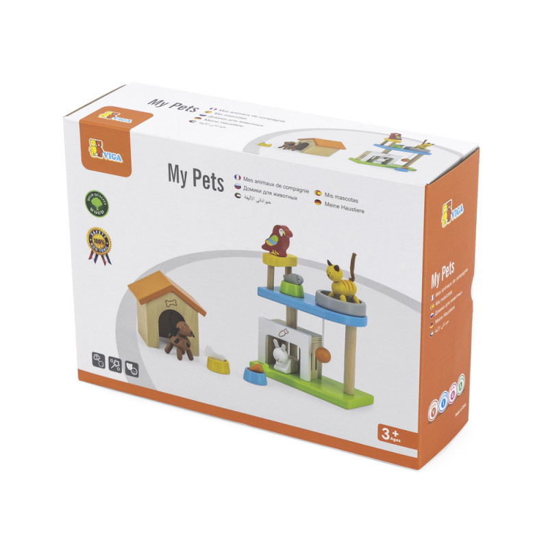Copiii adora acest scenariu si set pentru jocuri de rol!  Acest set de jucarii din lemn cu animale de companie este un accesoriu excelent pentru orice casa de papusi.De la catelusul lor iubit, pana la pisica lor blanda, iepurasul zglobiu si papagalul amuzant, aceste animale de companie vin cu casele lor, bolurile de mancare si mancarea si sunt gata de joaca!Copiilor le place sa creeze scenarii si povesti cu prietenii lor, iar acest set de jucarii din lemn pentru animale de companie este o modalitate perfecta de a incuraja dezvoltarea limbajului si a abilitatilor motorii. Jucarie educativa din lemn, Montessori.  Varsta recomandata: 3 ani+  Dimensiuni: 11,5 x 15,5 x 6 cm.  *AVERTISMENT! Contraindicat copiilor mai mici de 3 ani. Jucaria/produsul poate contine piese mici care se pot inghiti sau inhala existand pericolul de sufocare sau nu este potrivita copiilor mai mici de luni. Toate jucariile marca VIGA sunt fabricate din lemn de calitate cu vopsele si cerneluri non-toxice, supuse testelor de siguranta respectand standardele pentru jucarii ale Uniunii Europene EN71 si ASTM. Nu lasati ambalajul produsului la indemana copiilor. Indepartati orice ambalaj al produsului inainte de a da jucaria copilului. Va recomandam sa supravegheati copilul in timp ce se foloseste produsul. Pastrati instructiunile si etichetele pentru referinte viitoare. Feriti produsul de foc, temperaturi ridicate si umiditate.