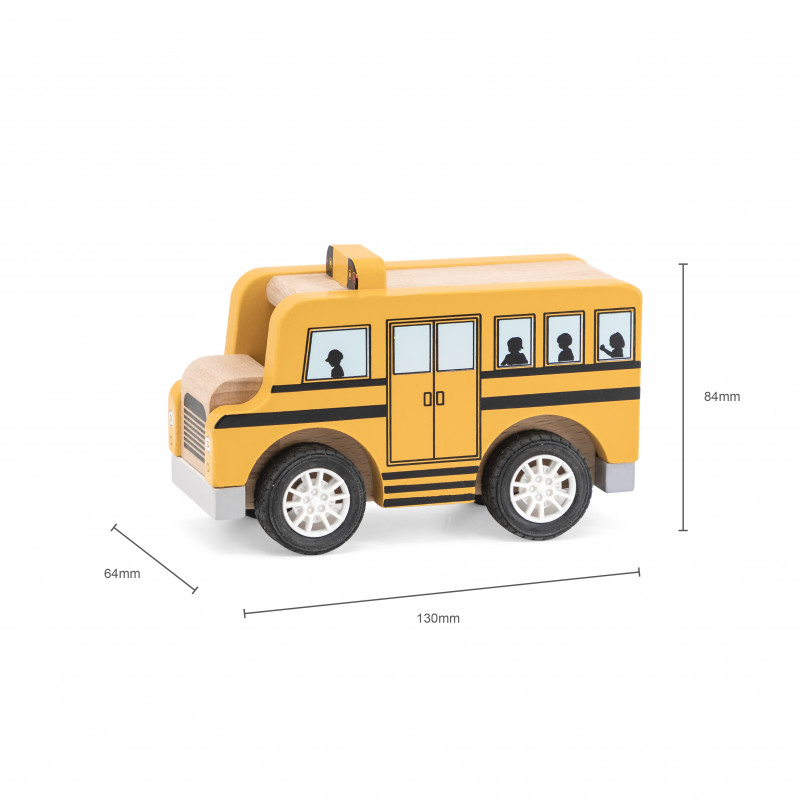 Masinuta din lemn reprezentand un autobus scolar.  Jucarie din lemn perfecta pentru a fi manevrata de micutele maini, in cadrul jocurilor individuale sau de grup. Copiii isi vor folosi imaginatia pentru a crea contextul jocului si pentru a reda sunetele emise in realitate de un autobus. Jucarie din lemn, tip Montessori.   Dimensiuni: 13 x 6.4 x 8.4 cm   Varsta recomandata: 18 luni+   *Atentie! Toate jucariile marca VIGA sunt fabricate din lemn de calitate cu vopsele si cerneluri non-toxice, supuse testelor de siguranta respectand standardele pentru jucarii ale Uniunii Europene EN71 si ASTM. Nu lasati ambalajul produsului la indemana copiilor. Indepartati orice ambalaj al produsului inainte de a da jucaria copilului. Va recomandam sa supravegheati copilul in timp ce se foloseste produsul. Pastrati instructiunile si etichetele pentru referinte viitoare. Feriti produsul de foc, temperaturi ridicate si umiditate.