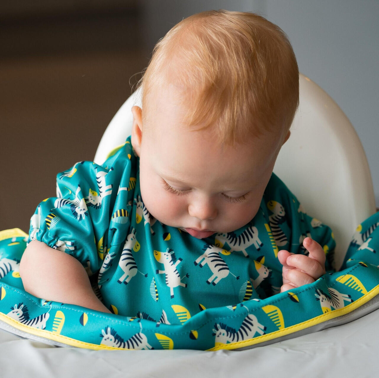 Baveta moderna cu maneci scurte, extrem de utila pentru a proteja hainutele copilasului atunci cand mananca sau cand se joaca. Se poate utiliza ca atare sau daca doriti o baveta de schimb pentru kit-urile pentru hranire Tidy Tot.