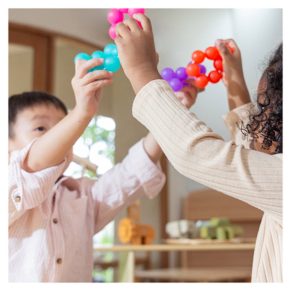• Cu ajutorul acestor siruri flexibile de margele, copiii pot construi modele geometrice, liniare si tridimensionale, fie ca urmeaza modelele de pe carduri sau isi folosesc creativitatea si imaginatia proprie.