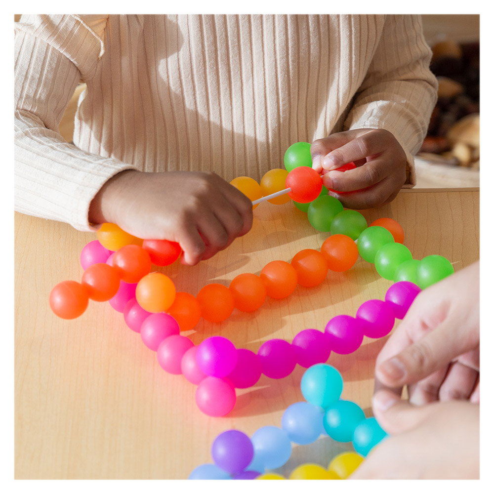 • Cu ajutorul acestui set de margele insirate pe elastic, copiii au posibilitatea de a experimenta si construi forme complexe, dezvoltand creativitatea, motricitatea fina, coordonarea ochi-mana, dexteritatea, rationamentul spatial si abilitatile de rezolvare a problemelor, in timp ce exploreaza lumea formelor si a structurilor geometrice.