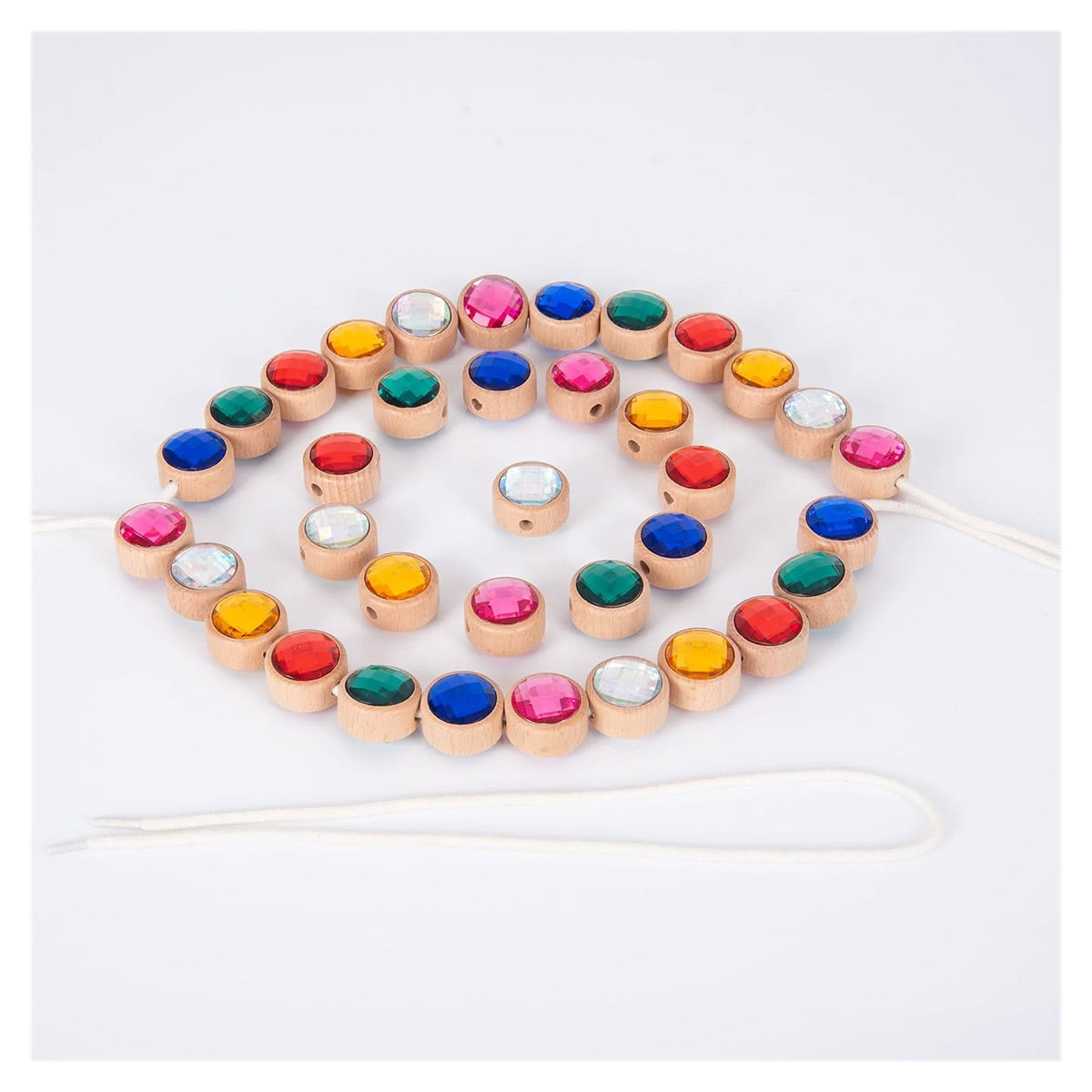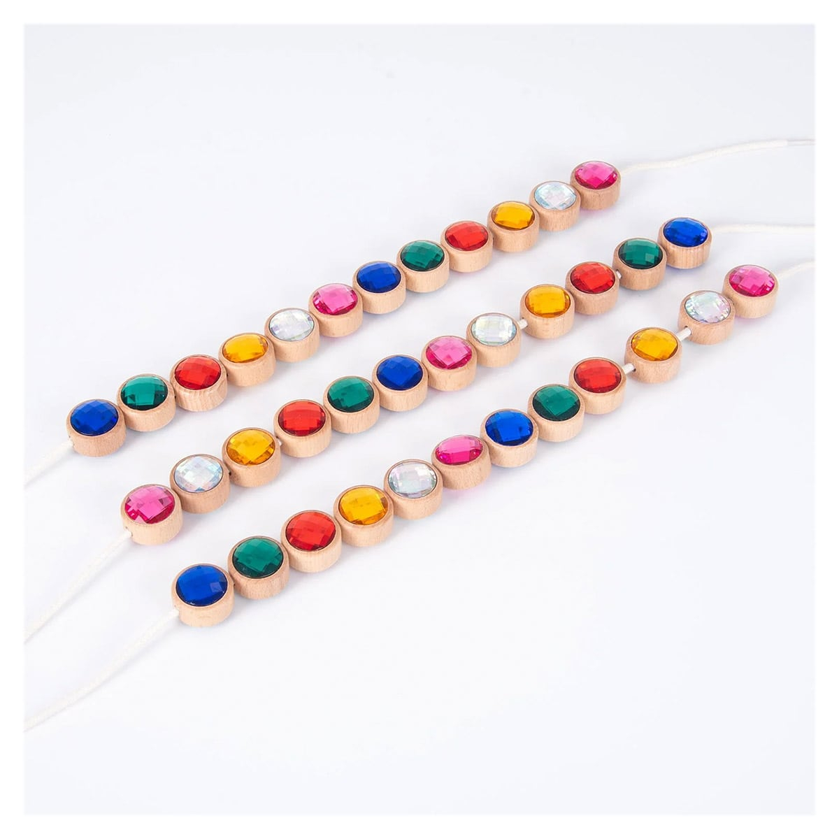 • Setul contine 39 de piese: 36 de bijuterii acrilice colorate stralucitoare cu rame din lemn, in sase culori vibrante (rosu, auriu, verde, albastru, roz, argintiu), cate sase din fiecare, 3 sireturi pentru insirat si un saculet cu snur pentru depozitare din bumbac.