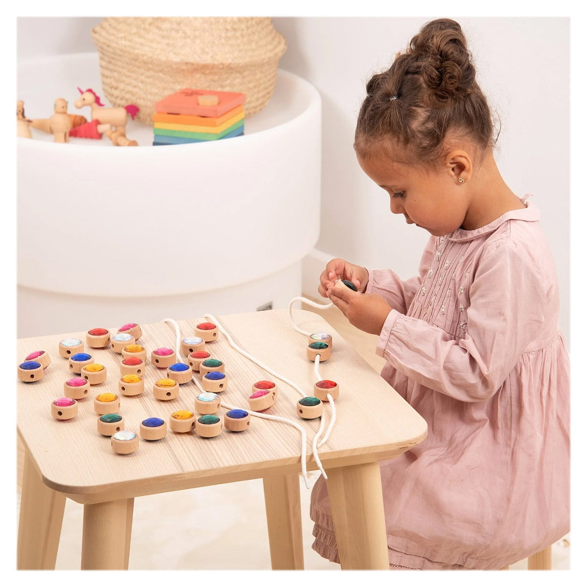 • Cadrul de lemn al fiecarei margele are o gaura centrala care permite insirarea bijuteriilor in modele sau succesiuni, incurajand creativitatea si explorarea vizuala.