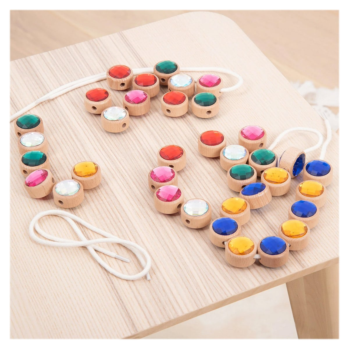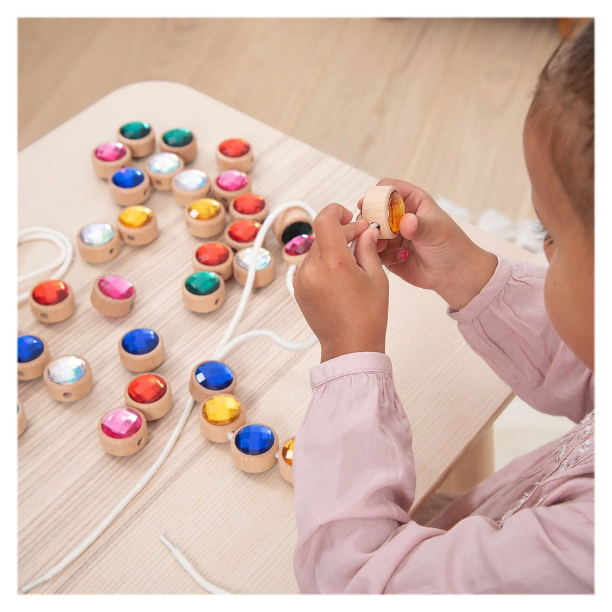 • Setul “Bijuterii acrilice de snuruit” de la TickiT ofera copiilor un joc vizual fascinant de forma si culoare, combinand margele acrilice colorate, stralucitoare si fatetate puse in rame solide si netede de lemn de fag certificat FSC.