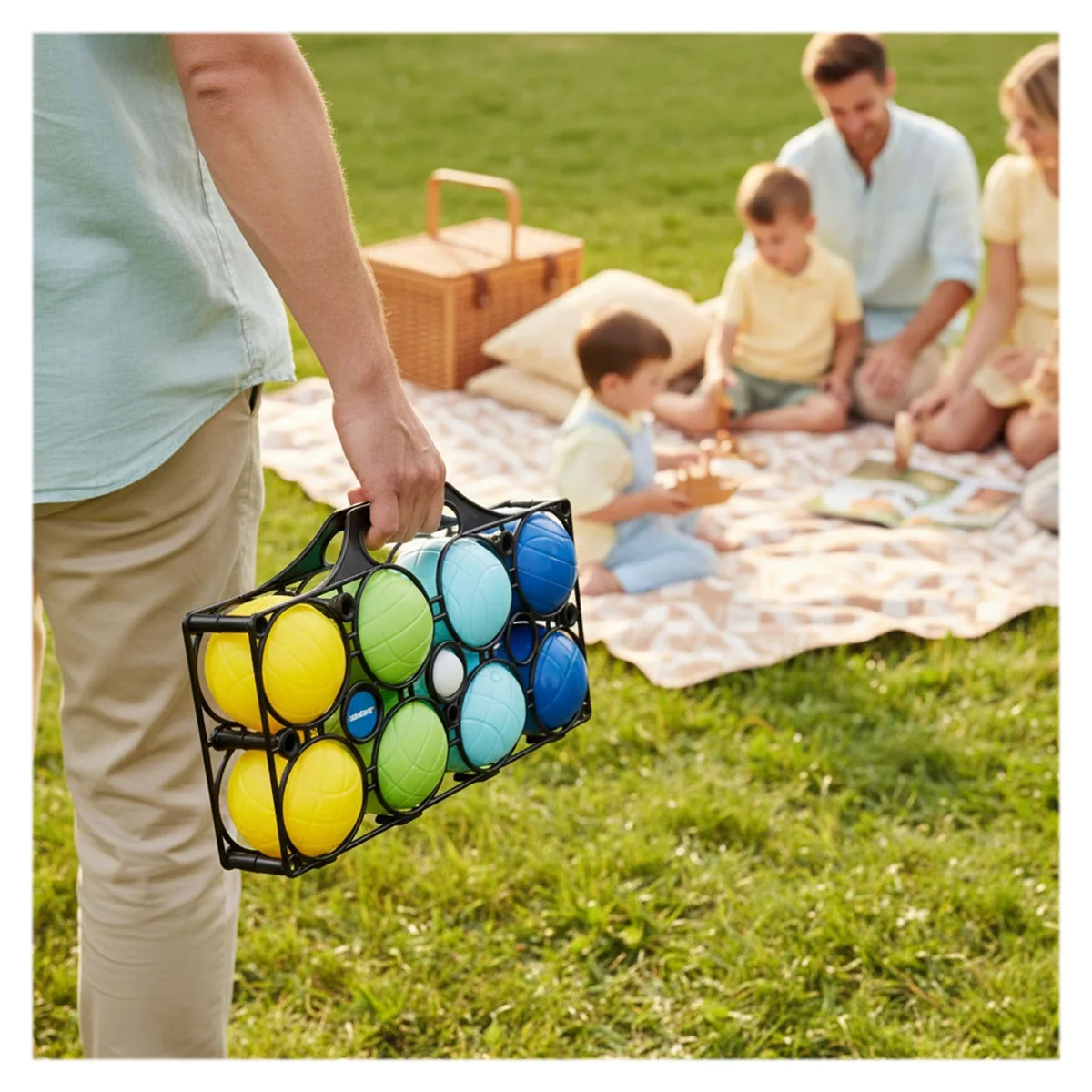 Bilele sunt realizate din material plastic rezistent, concepute pentru utilizare frecventă în exterior. Culorile diferite permit identificarea ușoară a echipelor, iar bila țintă adaugă un plus de strategie jocului. Coșul practic de transport inclus asigură că toate piesele pot fi depozitate cu grijă și transportate cu ușurință după joacă.
