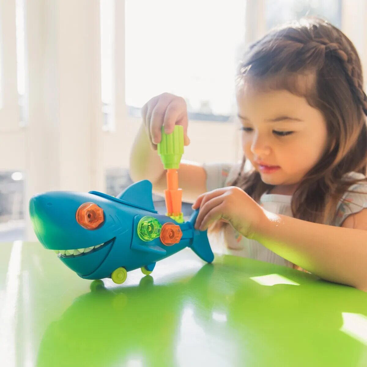 - Cu ajutorul surubelnitei solide, special concepute pentru mainile copiilor, cei mici pot asambla si dezasambla piesele rechinului, fixandu-le la locul lor cu suruburile colorate incluse in set