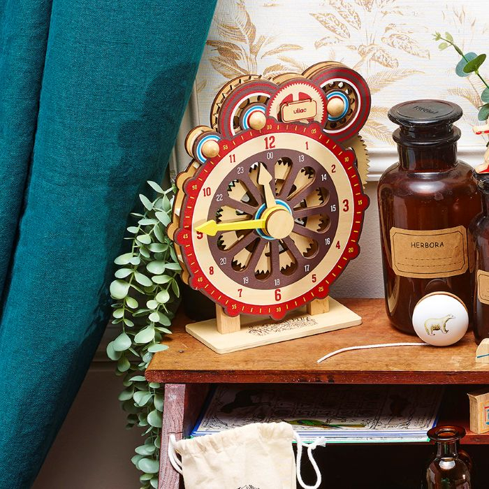 Descoperă ceasul de învățare din lemn, cu un design vintage! Acesta face parte dintr-o gamă largă de jocuri și jucării educaționale, pentru că nu există nimic mai valoros decât învățatul prin joacă. Copiii, încă de la vârste fragede, iubesc să se joace de-a școala, creând sau recreând scene din viața de zi cu zi la școală. Combinând partea ludică cu noțiuni serioase, copilul va ajunge într-o poziție constantă de învățare. Un ceas de învățare pentru a face ceea ce fac adulții Acest ceas manual de învățare este în deplină concordanță cu filozofia Montessori „copiii învață în ritmul lor, conform propriilor dorințe”. Ceasul va însoți copilul în învățarea noțiunii de timp, permițându-i să experimenteze singur mecanismul unui ceas. Nu are baterii, iar copiii manipulează acele manual. Prin acționarea acelor de minute, copilul va vedea cum se mișcă toate rotițele ceasului și va pune automat în mișcare acele de ore, precum și minutele și orele de pe ecranul „digital”. Manipulând acele, copilul va înțelege relația dintre mișcarea acelor ore și minute și corespondența lor digitală. Ceasul este prevăzut cu cartonașe cu întrebări: pe o parte, ora este scrisă în format digital, iar copilul trebuie să reproducă poziționarea acelor; pe cealaltă parte, este invers! Beneficii: Timpul este un concept foarte abstract pentru copii. Anii, lunile, sezoanele, zilele, orele... sunt noțiuni care necesită ani de învățare înainte ca un copil să înțeleagă mecanismul și logica lor. Una dintre provocările pentru copilul dumneavoastră va fi să înțeleagă citirea orei pe un ceas de mână, un ceas cu ace sau pe un ecran digital. Acest joc educativ este destinat copiilor curioși de la 6 ani în sus. La începutul școlii primare, copilul va consolida învățarea temporalității. După ce va învăța alternanța zi/noapte și zilele săptămânii, percepția sa asupra timpului se va rafina, iar noțiunile de ore, minute și secunde vor îmbogăți cunoștințele sale. Conținut: • 1 ceas de învățare din lemn • 24 cartonașe de tip quiz, față-verso • 1 ghid de utilizare Vârsta recomandată: 6 ani + Dimensiuni: 26 x 8 x 22 cm Material: lemn Brand: VILAC Avertisment: Jucărie testată în laborator, garantând conformitatea cu directiva 2009/48/CE pentru copiii cu vârsta peste 6 ani. ATENȚIE! Nu este recomandată copiilor sub 3 ani. Conține piese mici. Pericol de sufocare.