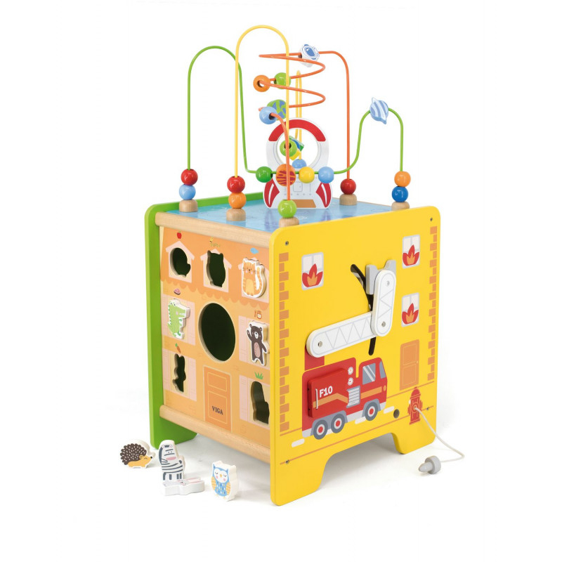 Un minunat centru gigant de activitati care inglobeaza 5 jucarii: sine cu margele, circuit de bile de condus pe traseu, roti dintate, sortator de forme cu animale, joc cu scara pompierilor. Partea superioara a cubului cuprinde un circuitul de sine cu margele avand ca tema universul. Margelele se misca pe orbite ca si cand ar fi fost propulsate in spatiu. Partea de sus poate fi intoarsa in jos si introdusa in cub pentru o depozitare mai usoara. Jucaria stimuleaza dezvoltarea coordonarii mana-ochi, gandirea, imaginatia si creativitatea. Jucaria multifunctionala oferta o varietate larga de activitati si jocuri, incurajand astfel socializarea si incurajand copiii sa imparta lucrurile cu ceilalti parteneri de joaca. Jucarie educativa din lemn, tip Montessori.