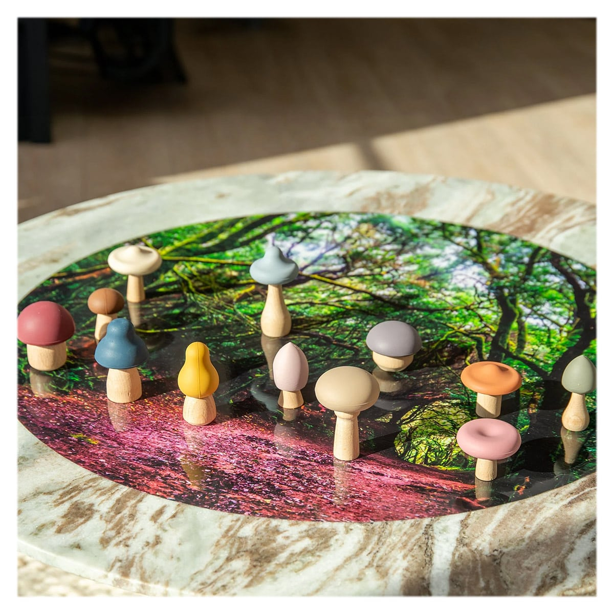 • Acest set cuprinde 12 ciupercute de padure diferite, avand piciorul din lemn natural si palarii din silicon alimentar, in culori frumoase naturale, inspirate de nuantele pamantului.