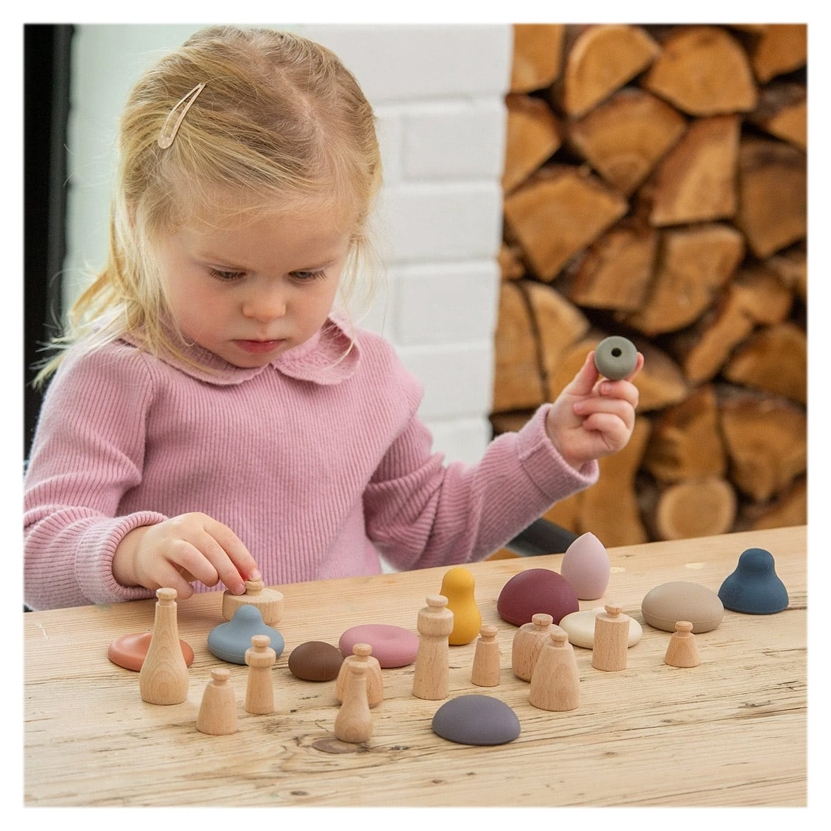 • Tulpinile netede din lemn si palariile colorate din silicon, care se desprind usor, invita copiii sa combine si sa asorteze, creand combinatii jucause care starnesc creativitatea si curiozitatea.