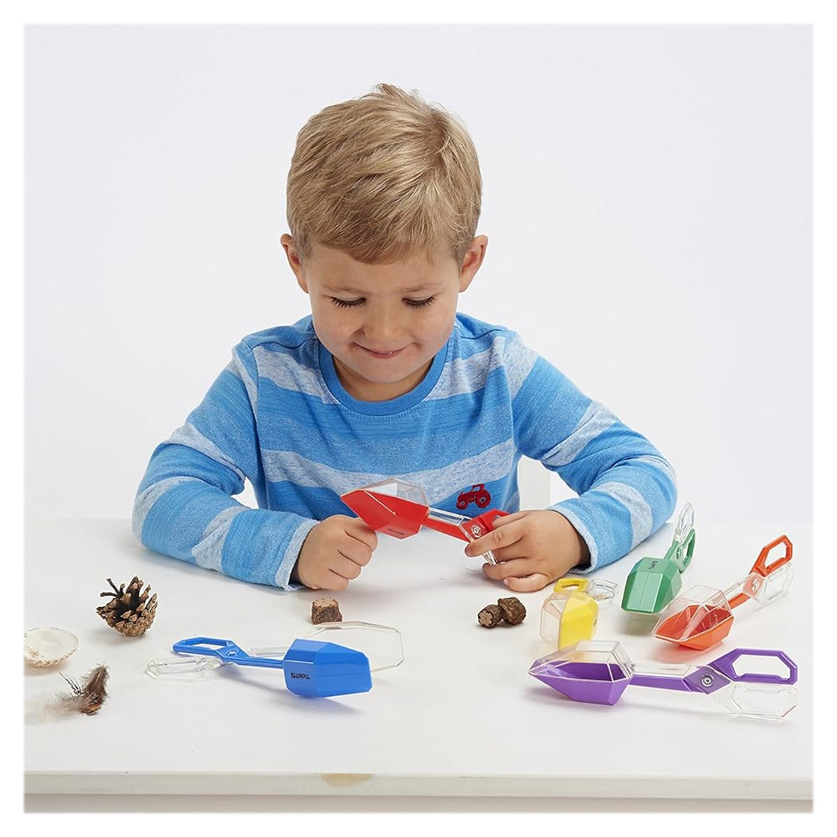 • Acest set de 6 perechi de linguri viu colorate, cu manere de foarfece, este ideal pentru activitatile de explorare si observare a mediului natural prin joaca si pentru dezvoltarea motricitatii fine si a coordonarii ochi-mana.