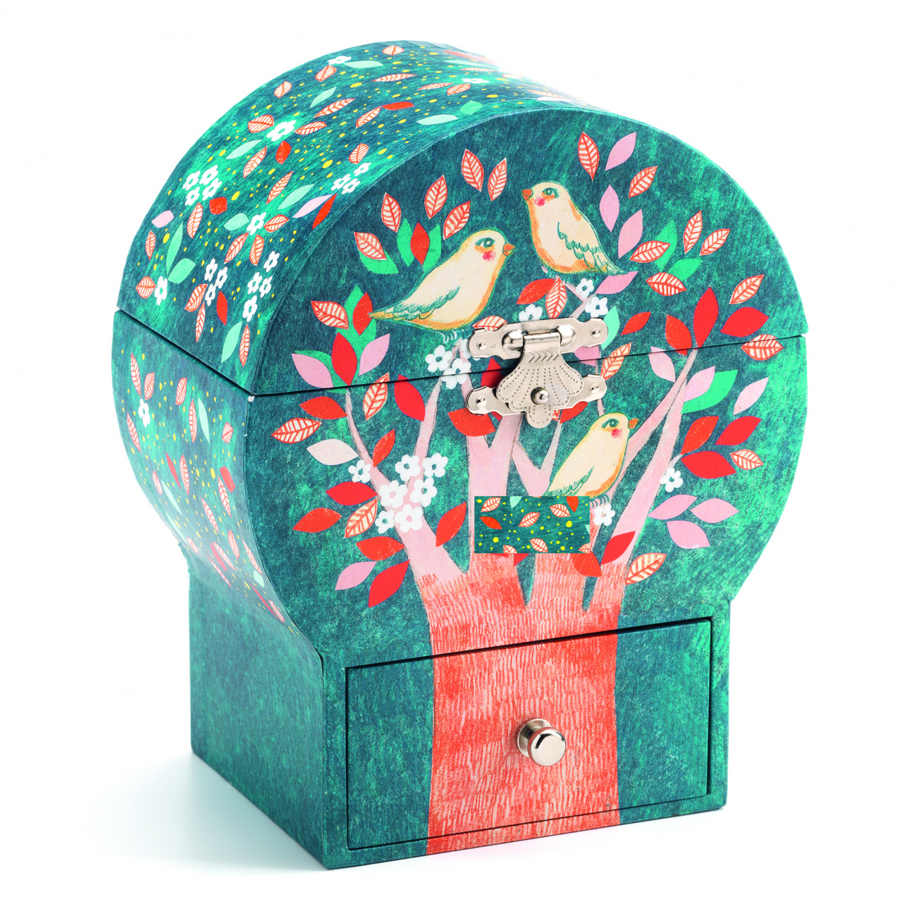 Varsta recomandata:  +4 ani. Cutie muzicala cu figurina pasare, cu sertar pentru bijuterii . Melodie: Povestiri din padurea vieneza. Compozitor: Johann Strauss Confectionata din carton si metal. AVERTISMENT: Acest articol nu este jucarie. A nu se lasa la indemana copiilor sub 3 ani. Producator: Djeco, Franta.
