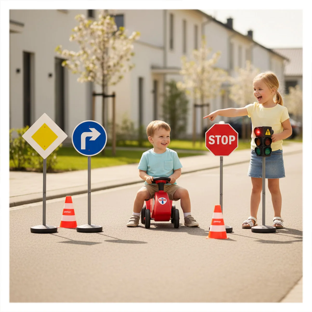 Setul XXL de educație rutieră cu un semafor înalt de 70 cm, 10 indicatoare rutiere realiste înalte de 75 cm și 4 conuri robuste este conceput pentru a-i ajuta pe copii să înțeleagă semnele și regulile de bază ale circulației. Prin jocuri de rol interactive, cei mici învață cum să fie pietoni sau "șoferi" responsabili.