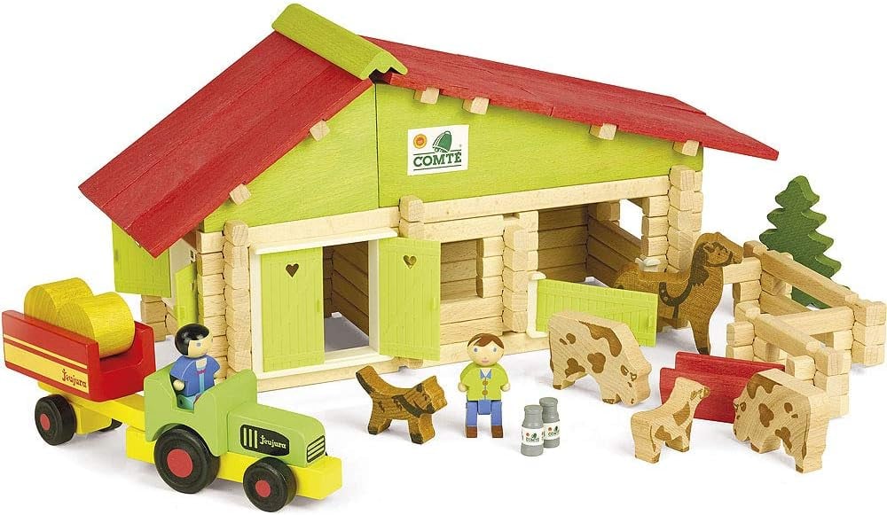 Varsta: 5 ani + Materiale: Lemn Dimensiune cutie : 32 x 11 x 26 cm O superba casuta de construit, din lemn natur si colorat, fara lipici, cu 140 de piese. Este ambalata intr-o valiza usor de transportat. Iclude animalele, tractorul, personajele, accesoriile ce se observa in fotografie. Include si un covoras din carton, pe care se va contrui ferma si se vor aseza accesoriile. Cu acest set micii arhitecti pot construi o casuta si cu ajutorul accesoriilor isi pot imagina povesti si jocuri. Un joc atemporal care a sedus generatii de copii...si adulti. Un cadou perfect pentru copiii cu varsta peste 5 ani. Acestia vor petrece ore intregi construind si amuzandu-se. Fabricat in Franta.