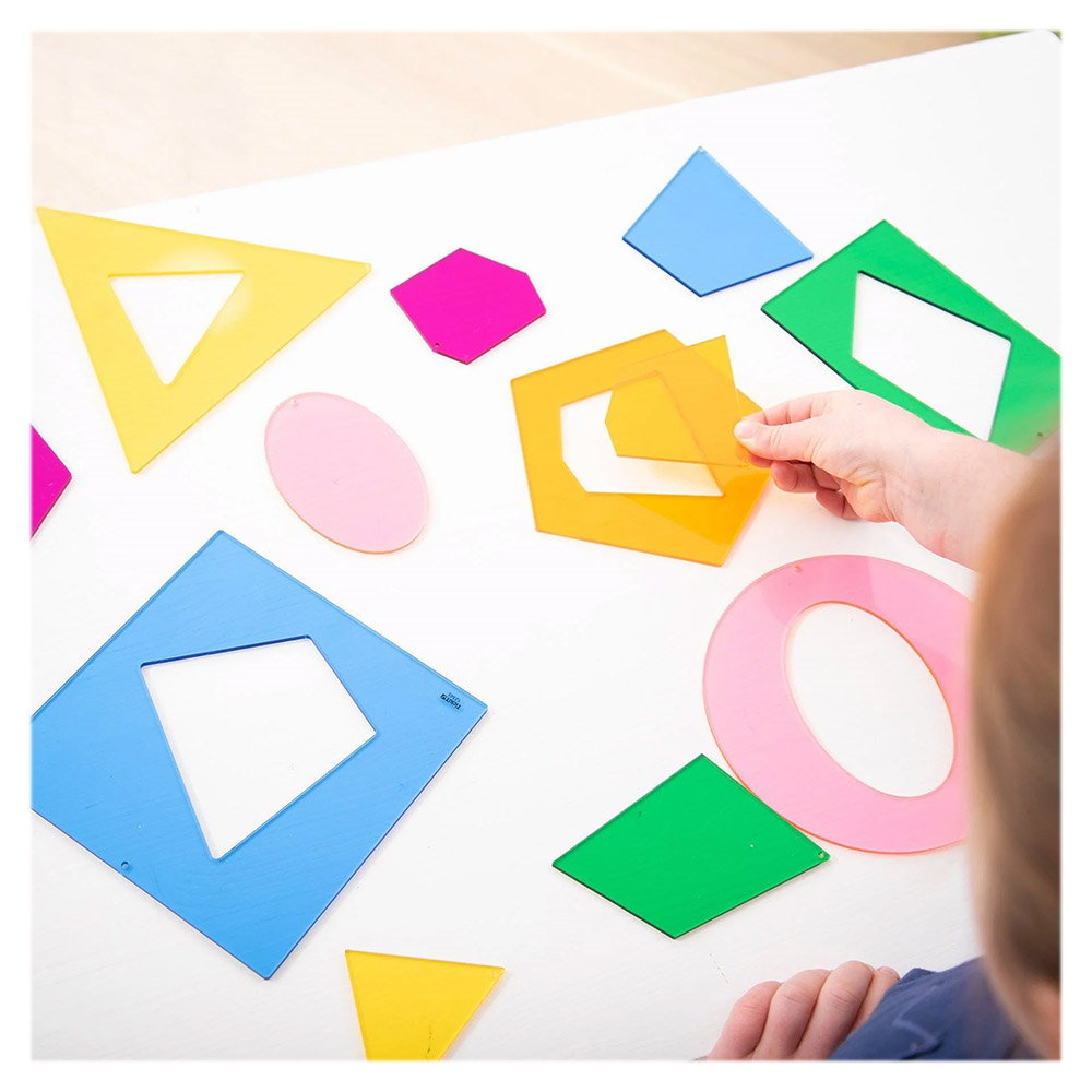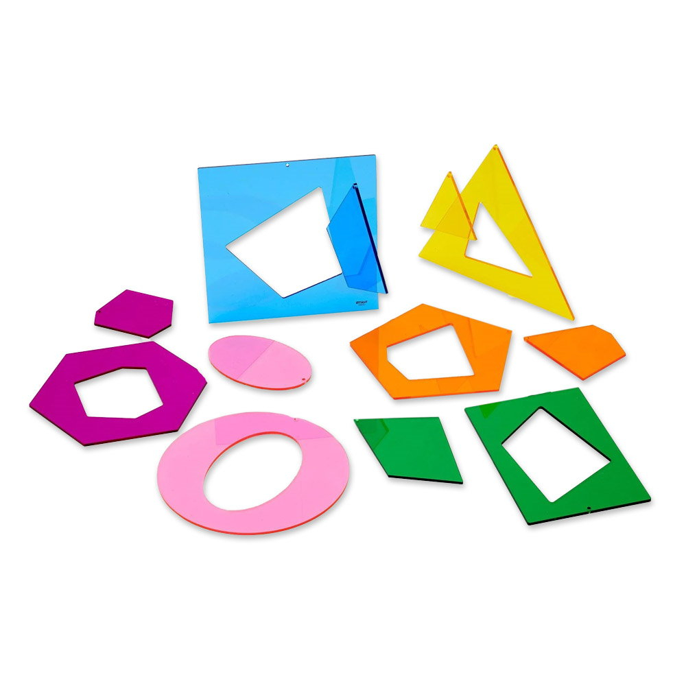 • Setul contine 12 forme (6 regulate si 6 neregulate) acrilice transparente colorate: albastru, verde, galben, roz, portocaliu si mov.