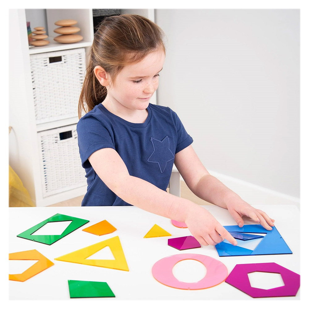 • De asemenea, setul este ideal pentru ca cei mici sa exploreze si sa se familiarizeze cu terminologia matematica si geometrica, cum ar fi: latura, punct, curba, interior, exterior, plat, 2D, solid, 3D, unghi si simetrie.