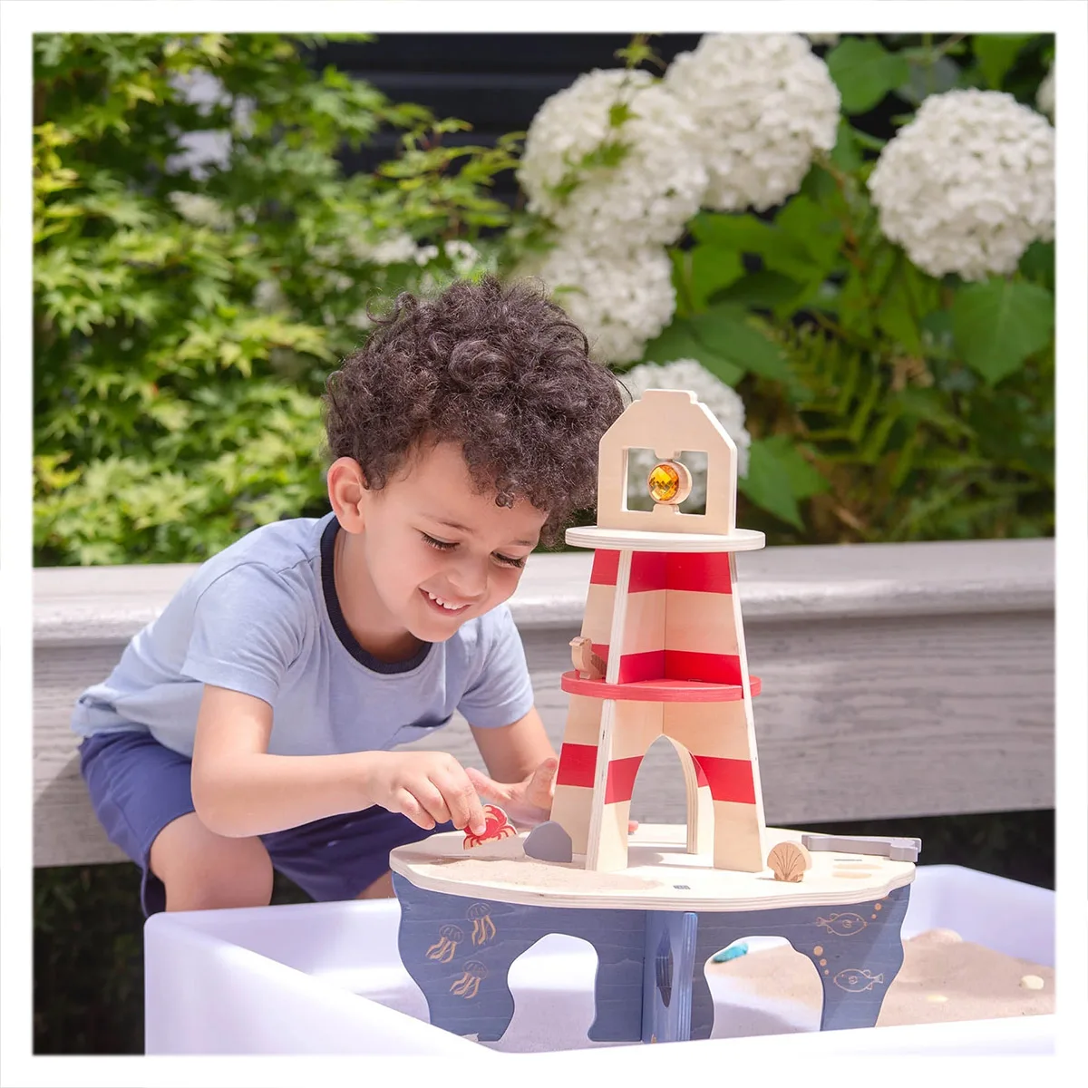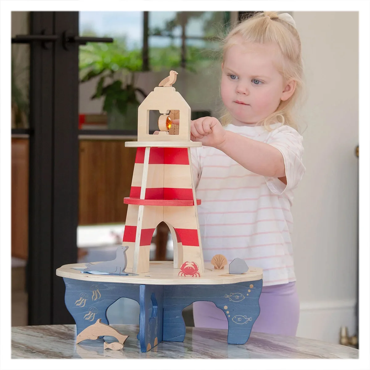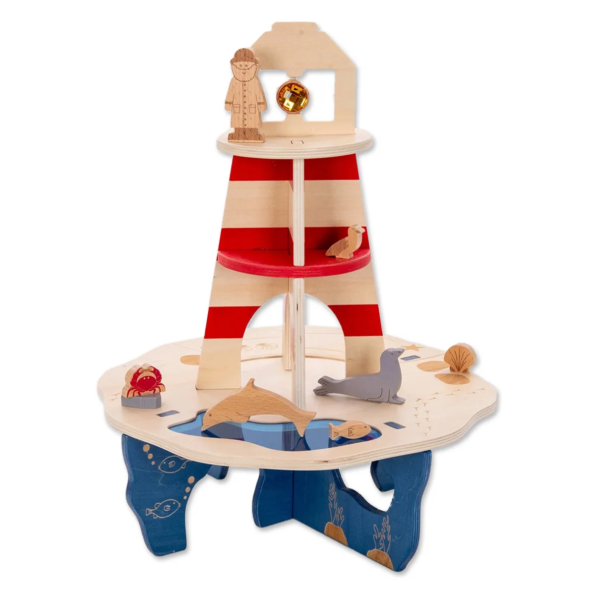 Farul este realizat din placaj neted de mesteacăn, iar detaliile gravate cu laser oferă o experiență tactilă interesantă pentru copii. În vârful farului se află un cristal rotativ din acril fațetat incadrat intr-o rama de lemn, care adaugă magie interactivă și încântare vizuală, iar la baza insulei există o piscină transparentă din acril perfectă pentru explorarea creaturilor marine sau pentru activități senzoriale.