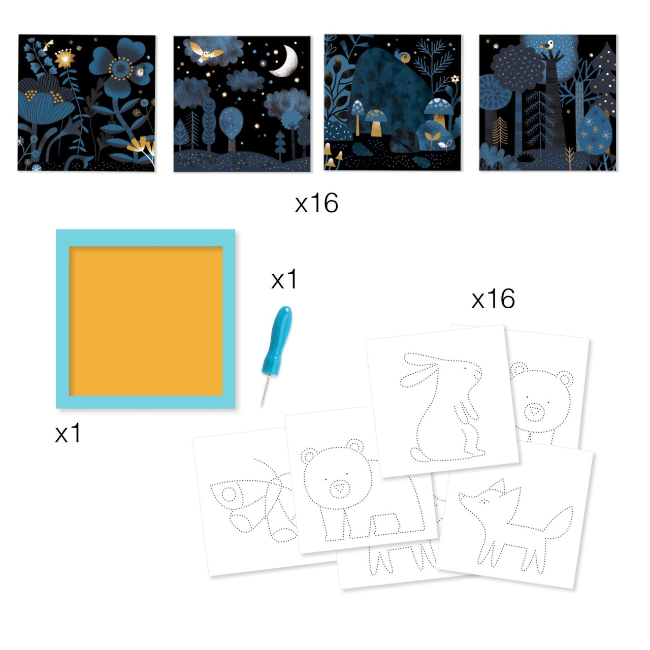 Joc de creatie Dezvaluirea imaginii Copilul alege un fundal si un animal de dezvaluit. Apoi, cele 2 foi se prind in suport. Cu ajutorul instrumentului el face gauri urmand punctele de pe sabloane. Plasati o sursa de lumina in spatele fundalului: surpriza, apare animalul! Dezvolta abilitatile motorii fine Copilul invata cum sa foloseasca o unealta in timp ce variaza cat de tare impinge Un suport inteligent ajuta pastrarea foilor la locul lor Activitate bazata pe metoda Montessori O brosura de instructiuni color care utilizeaza doar imagini. Dimensiune produs: 20 x 20 x 4.4. Continut: suport realizat din spuma si carton gros pentru a mentine foile, 16 fundaluri ilustrate, 16 sabloane, instrument de perforare, brosura. Varsta recomandata: +3 ani. Confectionat din materiale certificate FSC. AVERTISMENT: Contraindicat copiilor sub 3 ani. Contine parti mici. Se recomanda supravegherea copilului de catre un adult in timpul jocului. Producator: Djeco, Franta.