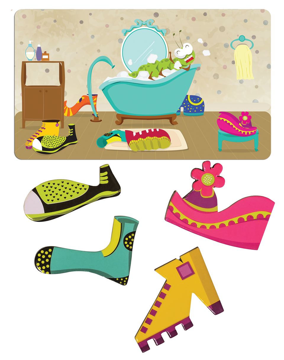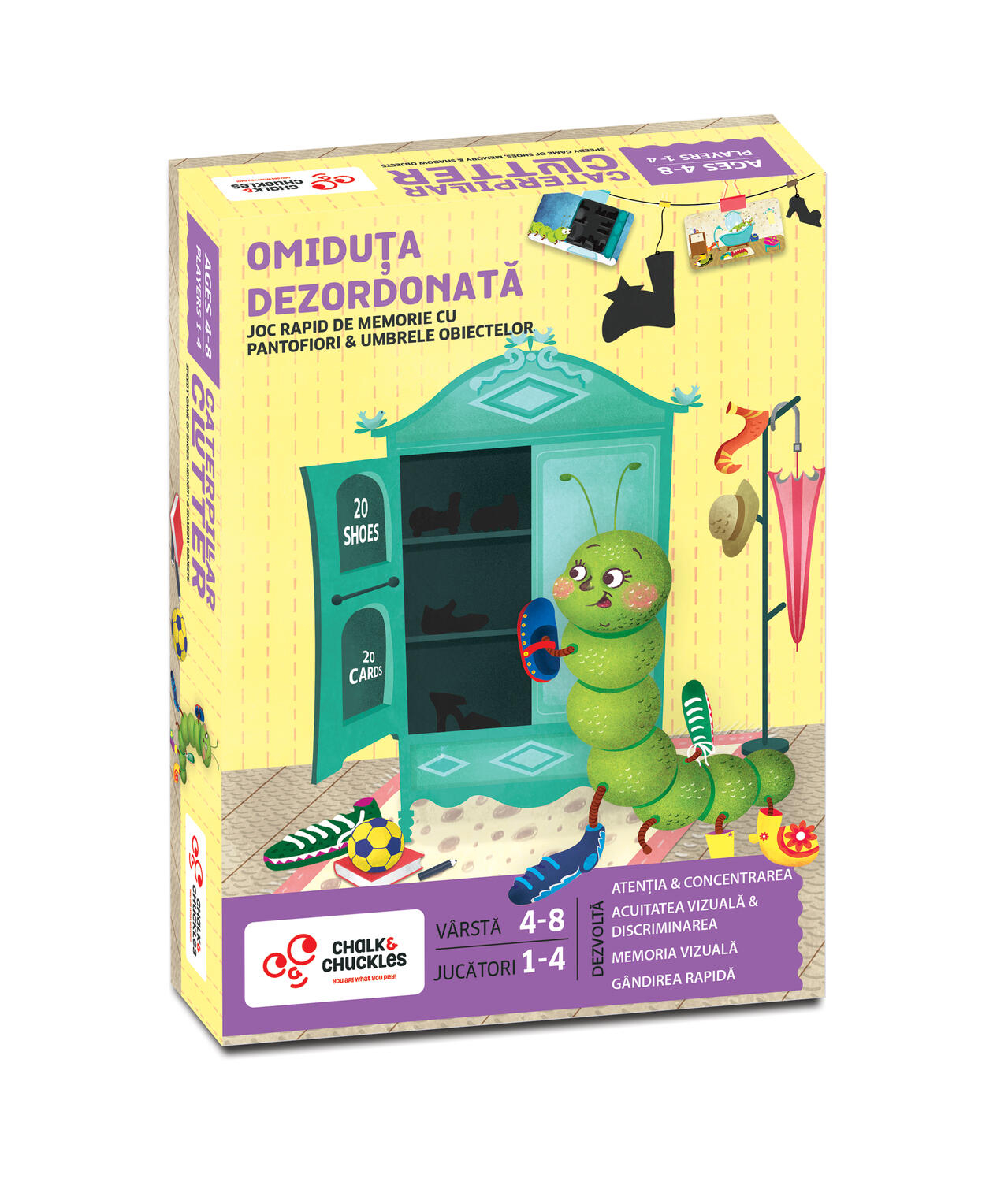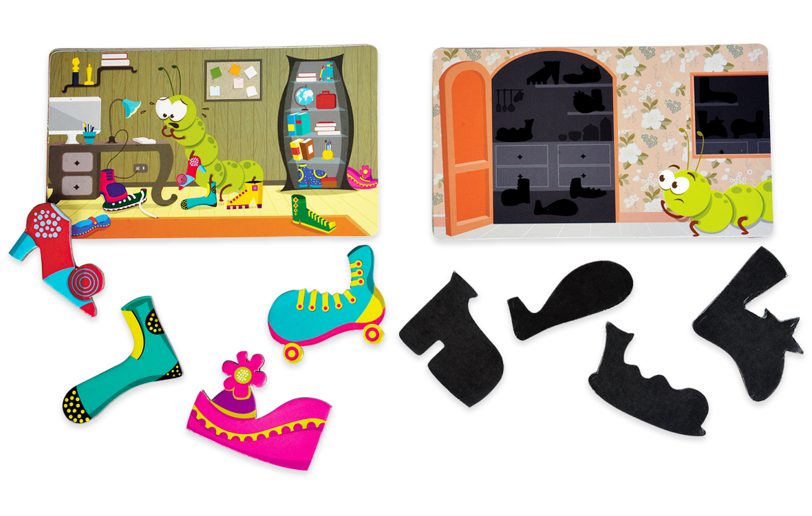 Regulament: Aranjeaza pantofii cu partea colorata in sus. Amesteca cardurile cu imagini si intoarce-le cu fata in jos in mijlocul zone de joc. Intoarce primul card si priveste-l cu atentie pentru a memora pantofiorii din imagine. Intoarce cardul la loc cu fata in jos si grabeste-te sa strangi pantofii pe care i-ai retinut. Jocul se termina cand au fost folosite toate cele 10 carduri cu imagini. Fiecare pantofior identificat corect valoreaza 1 punct. Daca ai ales un pantof care nu se afla in imagine, atunci ti se scade 1 punct. Jucatorul care are scorul cel mai mare castiga jocul. Un singur joc, mai multe variante! Poti identifica pantofiorii colorati care corespund incaperilor in care este lumina aprinsa sau poti juca varianta mai palpitanta, in care incaperile au lumina stinsa, iar tu trebuie sa gasesti umbrele pantofilor. O alta varianta de joc este aceea in care micutii isi folosesc imaginatia si creativitatea pentru a descrie in detaliu fiecare imagine in parte si fiecare pantofior sau identifica emotiile omidutei Catty.
