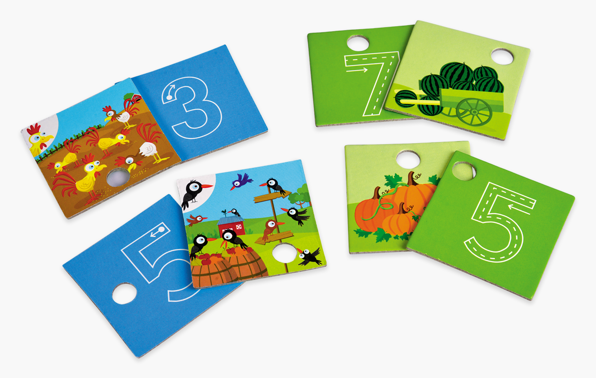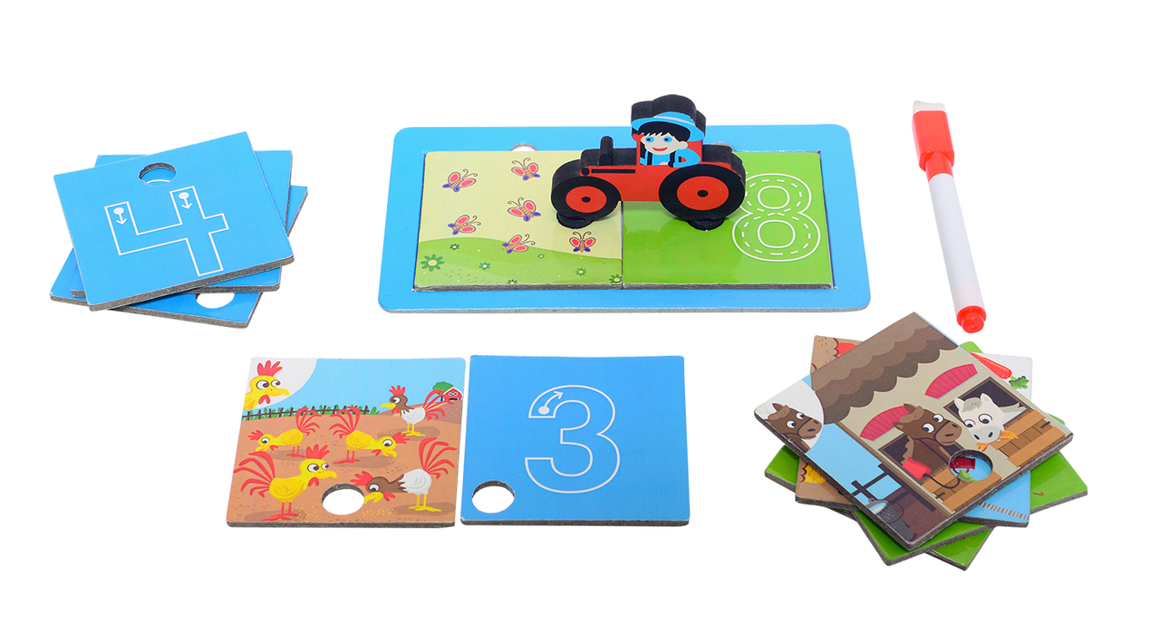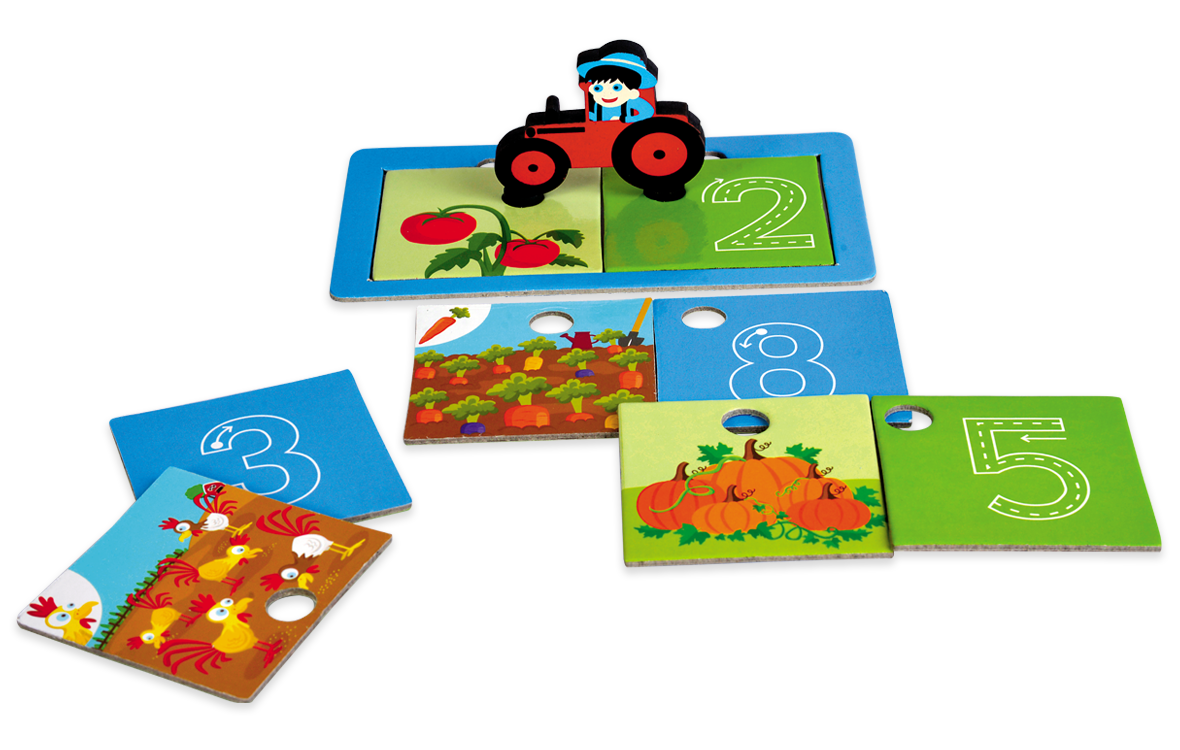 Regulament: Pune cele 20 de carduri de masa. Amesteca-le bine si intinde-le pe masa cu fata in sus. Ca sa iti fie mai usor, poti sa pui cardurile cu imagini, separat in partea stanga, iar pe cele cu numere in partea dreapta. Asaza rama in fata ta. Ia un card cu imagine si pune-l in interiorul ramei,in partea stanga. Numara obiectele din imagine si cauta cardul cu cifra corespunzatoare. Pune cardul cu numar in interiorul ramei, in partea dreapta. Verifica corectitudinea rezultatului punand tractorul cu rotile in gaurile cardurilor. Daca tractorul nu se potriveste exact in gaurile cardurilor inseamna ca trebuie sa mai cauti. Daca ai identificat corect perechea de carduri, pune-o deoparte. Un singur joc, mai multe variante. Jocul evolueaza de la numaratul simplu la cel mai complex. In plus, copiii pot folosi cardurile cu numere pentru a invata sa reproduca corect cifrele. Ei vor urmari cu degetelele conturul cifrelor, iar apoi cu ajutorul marker-ului inclus in set vor face conturul, urmarind linia punctata.