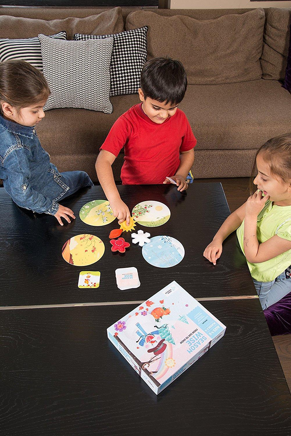 Regulament: Jucatorul care isi aminteste primul un cantecel cu anotimpuri incepe jocul. El/ea trage un card din teancul din centru. Toti copiii se uita la cardul respectiv si se gandesc la ce anotimp il pot incadra. Dupa ce ai stabilit anotimpul, alege una dintre cele 4 piese din fetru (floricica, soare, frunza sau fulg de nea) si asaz-o pe cardul cu anotimpul corespunzator. Primul jucator care pune piesa de fetru corecta peste anotimpul potrivit castiga cardul tras din teanc. Spre exemplu, cardul tras din teanc este un “Ventilator”. “Ventilatorul” apartine anotimpului “vara”. Primul jucator care asaza “Soarele” din fetru peste cardul cu anotimpul “Vara” castiga cardul cu “Ventilator”. Daca un jucator nu alege piesa din fetru corecta sau o asaza peste un alt anotimp, trebuie sa puna la loc in teanc un card castigat in rundele anterioare. Daca nu a castigat inca nici un card, atunci nu face nimic. Jocul se termina cand cardurile din teanc s-au terminat. Jucatorul care la sfarsitul jocului are cele mai multe carduri castiga jocul.