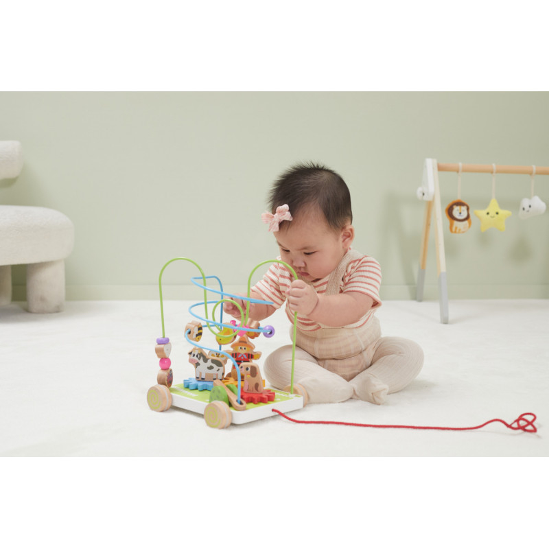 Hai sa facem animalele de ferma sa se invarteasca! Aceasta jucarie din lemn multifunctionala este proiectata pentru a starni curiozitatea, a incuraja miscarea si a dezvolta abilitati esentiale intr-un mod placut. Joc interactiv: include roti colorate, margele pe sarma si un flipper. Sperietoarea de ciori, cainele si vaca sunt detasabile si pot fi schimbate, adaugand o nota creativa la timpul de joaca. Design clasic din lemn: o jucarie atemporala care aduce farmecul mestesugului din lemn, asigurand durabilitate si siguranta.Beneficii: Incurajeaza mersul: motiveaza bebelusii sa faca primii pasi, promovand activitatea fizica si increderea. Dezvolta abilitati motorii fine: Imbunatateste coordonarea mana-ochi si dexteritatea prin joc interactiv. Imbunatateste perceptia vizuala: dezvolta recunoasterea culorilor si urmarirea vizuala pe masura ce privesc rotile rotindu-se. Promoveaza creativitatea: permite jocul imaginativ cu animalele de ferma detasabile si interschimbabile.Ofera copilului tau combinatia perfecta de distractie si invatare! Jucarie educativa din lemn, Montessori. Material: lemn  Dimensiuni: 25 x 20 x 19,5 cm; Varsta recomandata: 18 luni+  Ambalare: 1 colet, 0.5 kg AVERTISMENT! Contraindicat copiilor mai mici de 18 luni. Jucaria/produsul poate contine piese mici care se pot inghiti sau inhala existand pericolul de sufocare sau nu este potrivita copiilor mai mici de luni. Toate jucariile marca VIGA sunt fabricate din lemn de calitate cu vopsele si cerneluri non-toxice, supuse testelor de siguranta respectand standardele pentru jucarii ale Uniunii Europene EN71 si ASTM. Nu lasati ambalajul produsului la indemana copiilor. Indepartati orice ambalaj al produsului inainte de a da jucaria copilului. Va recomandam sa supravegheati copilul in timp ce se foloseste produsul. Pastrati instructiunile si etichetele pentru referinte viitoare. Feriti produsul de foc, temperaturi ridicate si umiditate.