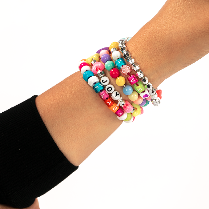 Conține mărgele ABC de diferite tipuri, combinabile cu alte mărgele colorate și fluorescente pentru a crea brățări super fashion! Un set perfect pentru mici designeri de bijuterii.