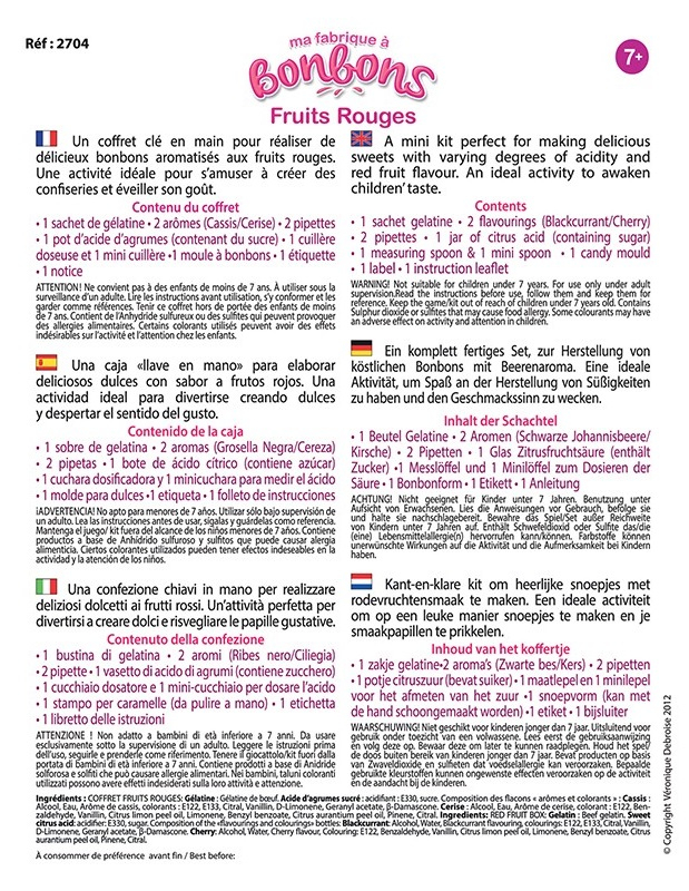 Cu acest mini kit culinar realizati acasa bomboane delicioase cu aroma naturala de fructe rosii! Cu forme multiple si arome savuroase, acest set este o adevarata invitatie la rasfat. Un joc culinar educativ pentru a trezi si incanta papilele gustative ale celor mai pofticiosi, realizand pana la 375 de grame de bomboane. Ingrediente: Acest set a fost dezvoltat respectand normele cumulate ale industriei jucariilor si agro-alimentare. Contine ingrediente si formule care nu prezinta niciun pericol pentru copii. Gelatina: gelatina de vita. Acid citric indulcit: acidifiant: E330, zahar. Coacaze negre: Alcool, Apa, Aroma de coacaze negre, coloranti (E122, E133). Cirese: Alcool, Apa, Aroma de cirese, colorant (E122). Aromele contin urmatorii alergeni: Benzaldehida, Benzoat de benzil, Citral, Ulei de coaja de Citrus Aurantium, Ulei de coaja de lamaie, β-Damascona, Acetat de geranil, Limonen, Pinen, Vanilina. Contine anhidrid sulfuric sau sulfiti, care pot provoca alergii alimentare. Contine: • 1 plic cu 20 gr de gelatina • 2 arome naturale: coacaze negre si cirese • 1 recipient cu acid citric • 1 lingurita dozatare • 2 pipete • 1 mini lingurita • 1 matrita pentru bomboane • 1 cutie pentru a pastra bomboanele si 1 eticheta • notita explicativa Varsta recomandata: 7 ani+ Dimensiuni cutie: 17.5 x 13 x 4 cm Materiale: diverse Brand: SENTOSPHERE ATENTIE! Nu este potrivit pentru copiii sub 7 ani. A se folosi sub supravegherea unui adult. Cititi instructiunile inainte de utilizare, respectati-le si pastrati-le pentru referinta. Tineti acest set departe de copiii sub 7 ani. Contine anhidrid sulfuric sau sulfiti, care pot provoca alergii alimentare. Anumiti coloranti utilizati pot avea efecte nedorite asupra activitatii si atentiei la copii. Descarcă instrucțiunile în limba română