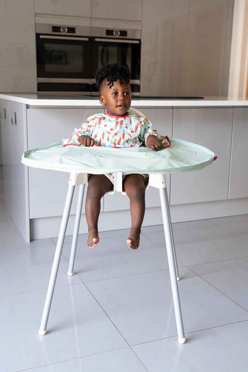 Modul de utilizare: Simplu ca o joaca de copil! Prindeti tavita cu ajutorul ventuzelor de scaunul de masa/booster, apoi atasati baveta cu ajutorul sistemului de prindere cu arici, imbracati copilasul cu baveta si sunteti pregatiti de masa sau de joaca!