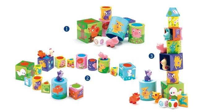 Jocuri clasice pentu cei mici|pentru dezvoltarea memoriei|a indemanarii si obisnuirea cu regulile simple ale jocurilor de societate. Puteti de asemenea gasi numeroase alte variante de joaca cu figurinele si cuburile din set. Jocul contine 2 zaruri (unul colorat si unul inscriptionat cu animalutele care se regasesc in set)|cuburi si cilindri de diferite marimi si culori|6 figurine (vacuta|porcusor|iepuras|pasare|catel|pisica). Confectionat din  materiale non-toxice|cu vopsele non-toxice|conform reglementarilor EN71 ;ASTM. Varsta recomandata: +18 luni. AVERTISMENT: Contraindicat copiilor sub 18 luni. A se utiliza sub directa supraveghere a unui adult. Producator: Djeco|Franta