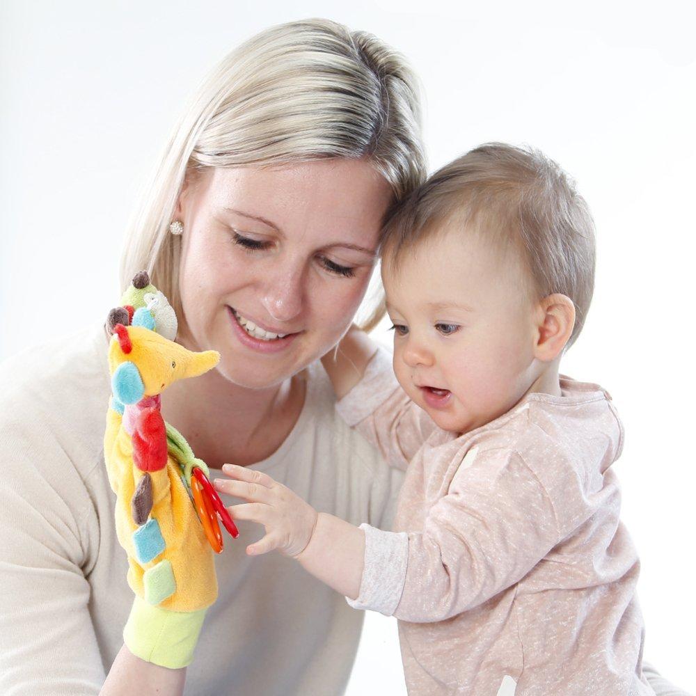 Elefantelul si maimutica jucausa sunt nerabdatori sa-si cunoasca viitorul prieten, iar aceasta manusa cu activitati ii va tine in suspans si va stimula simturile