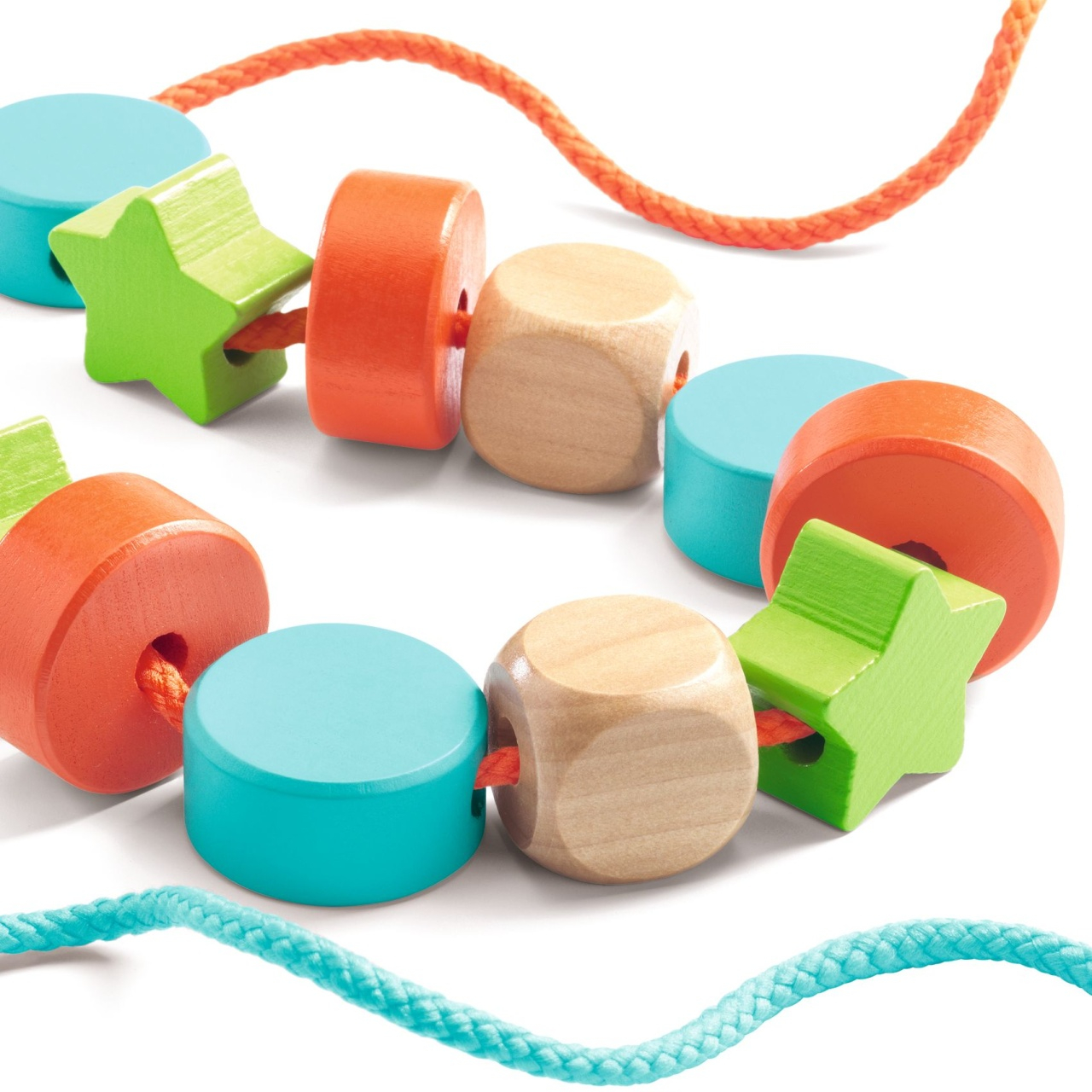 Varsta recomandata: + 2 ani. Jocul contine 24 piese din lemn de diferite forme si culori si 2 snururi, pe care copilul le poate insira. Ajuta la dezvoltarea motricitatii fine, a coordonarii ochi-mana. Dimensiune aproximativa a pieselor: 2.5 cm cubul; 3 cm steaua; 3 cm cercul. Confectionat din lemn, cu vopsele non-toxice, conform reglementarilor EN71 & ASTM.  Avertisment, contine snur, contraindicat copiilor mai mici de 2 ani. A se utiliza sub atenta supraveghere a unui adult. Producator: Djeco, Franta