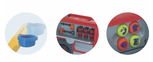Atentie - pompierii sunt la datorie! O masina de pompieri completa, cu toate detaliile necesare: platforma care se ridica, girofaruri, sunete de motor si alte 4 sunete aditionale - telefon, alarma, sirena si scara care se ridica.   Soferul si colegul sau "vorbesc" cand sunt apasati.   Bateriile sunt incluse.  Dimensiuni: 35 cm lungime, 44 cm inaltime, cu platforma mobila ridicata.