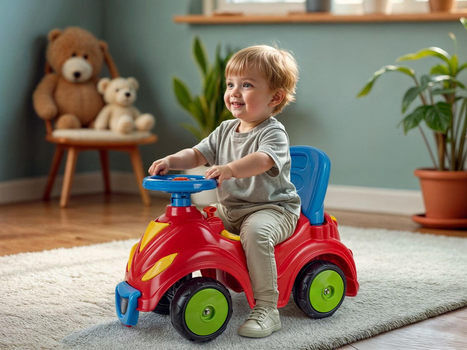 Masinuta este ideala pentru dezvoltarea motricitatii, pentru ca poate fi folosita in doua etape de dezvoltare ale copilasului dumneavoastra: