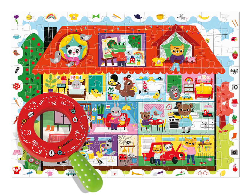 Când puzzle-ul este gata, distracția continuă cu un joc de-a detectivul! Folosește lupa specială, cu mâner din lemn, ca să găsești toate obiectele ascunse în imagine.