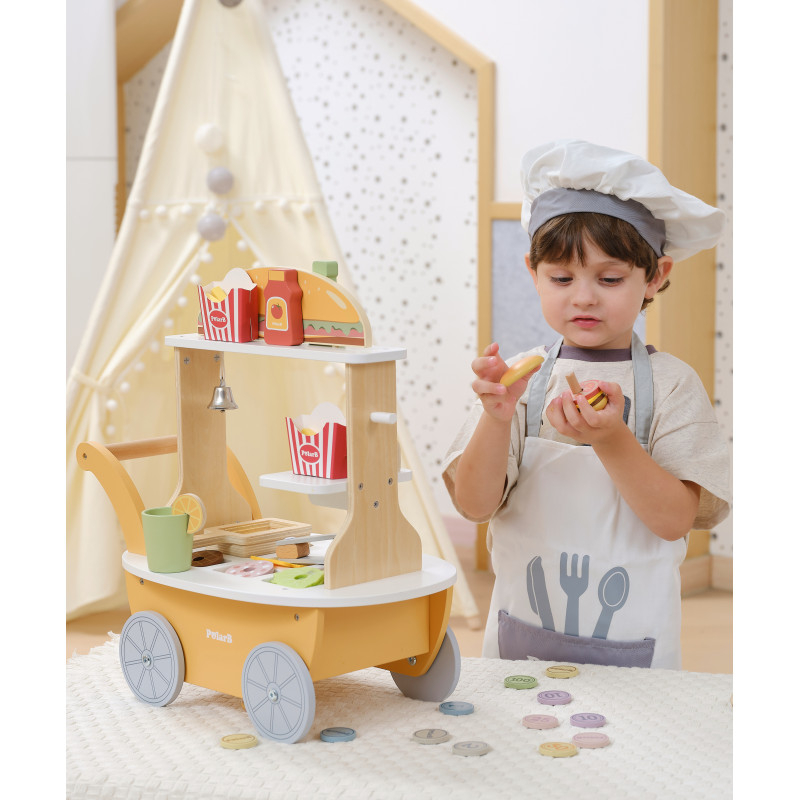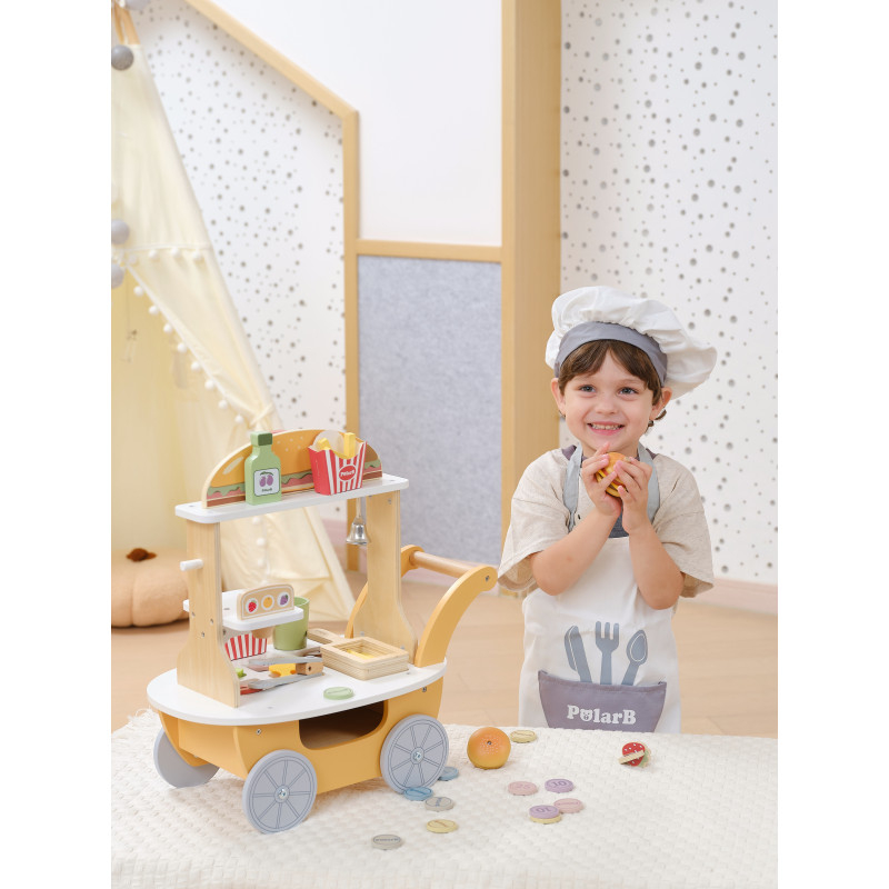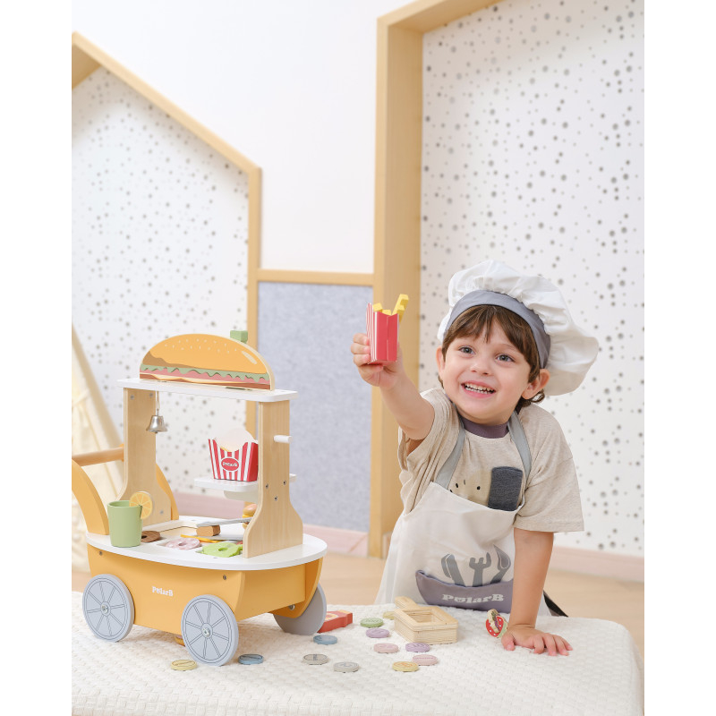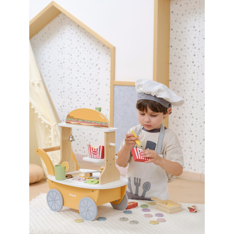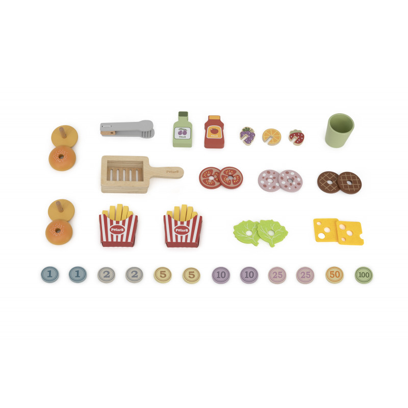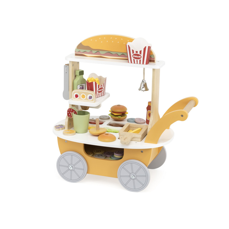 Acest mini restaurant de hamburgeri, colorat si atractiv, ii invita pe cei mici sa prajeasca cartofi crocanti, sa construiasca burgeri deliciosi si sa serveasca bauturi, oferind o experienta de joaca de rol interactiva si distractiva.Setul include 46 de accesorii – chifle, chiftele, legume, cartofi prajiti, ketchup, ulei de masline, cleste si bani de jucarie, ideale pentru a incuraja jocul de rol, dezvoltarea imaginatiei si invatarea timpurie a conceptelor de bani.Copiii pot intra in stand pentru a juca rolul de vanzator sau pot sta in fata ca client, ceea ce stimuleaza creativitatea, comunicarea, abilitatile sociale si ofera ore intregi de joaca educativa Montessori. Dimensiuni: 43,8 x 26 x 45 cm Varsta recomandata: 3 ani+ Jucarie educativa din lemn, Montessori.   *AVERTISMENT! Toate jucariile marca VIGA sunt fabricate din lemn de calitate cu vopsele si cerneluri non-toxice, supuse testelor de siguranta respectand standardele pentru jucarii ale Uniunii Europene EN71 si ASTM. Nu lasati ambalajul produsului la indemana copiilor. Indepartati orice ambalaj al produsului inainte de a da jucaria copilului. Va recomandam sa supravegheati copilul in timp ce se foloseste produsul. Pastrati instructiunile si etichetele pentru referinte viitoare. Feriti produsul de foc, temperaturi ridicate si umiditate.