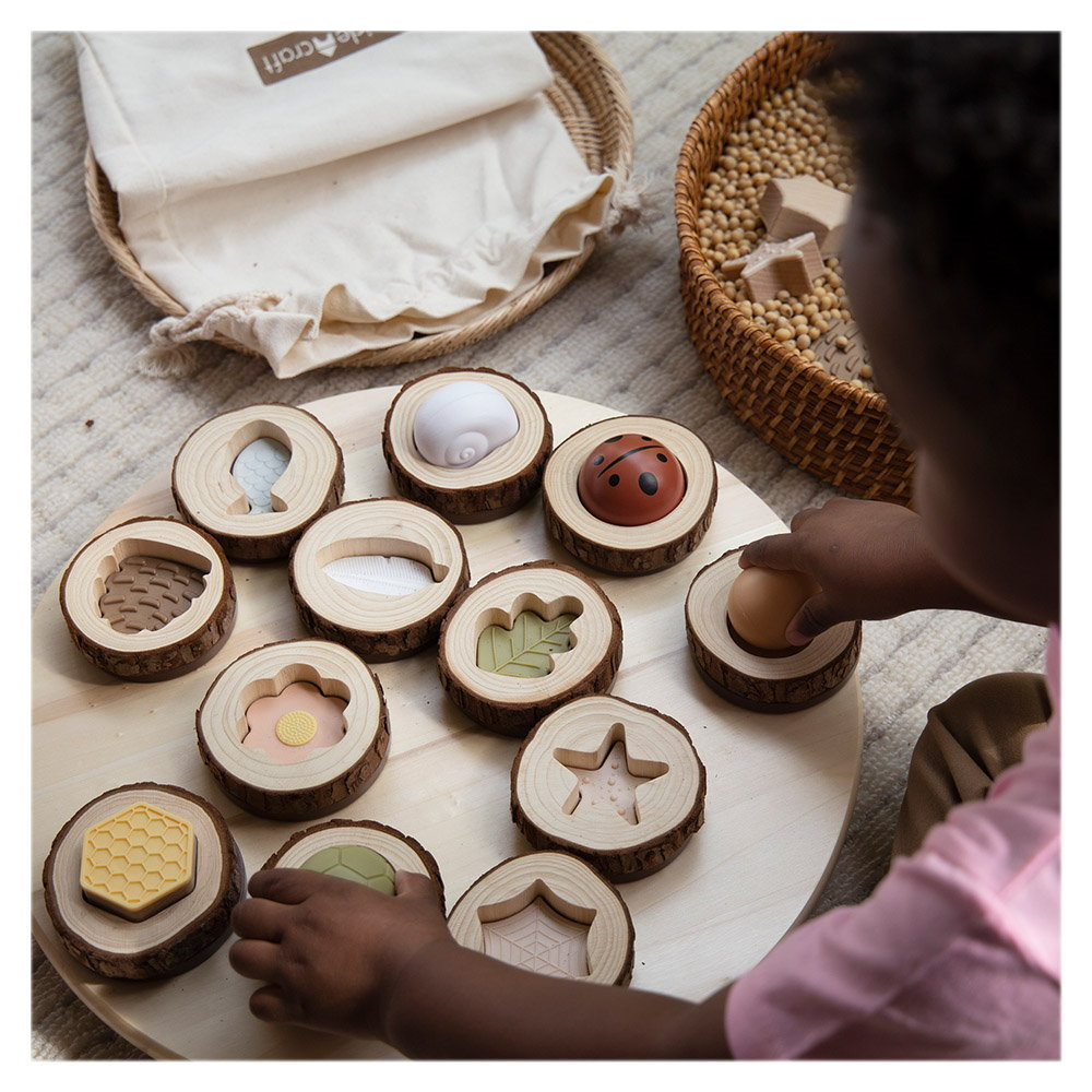 • Antreneaza-ti memoria si simtul tactil cu acest joc captivant din lemn cu motive inspirate din natura!