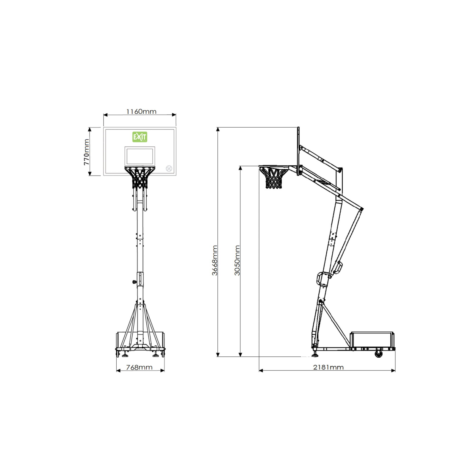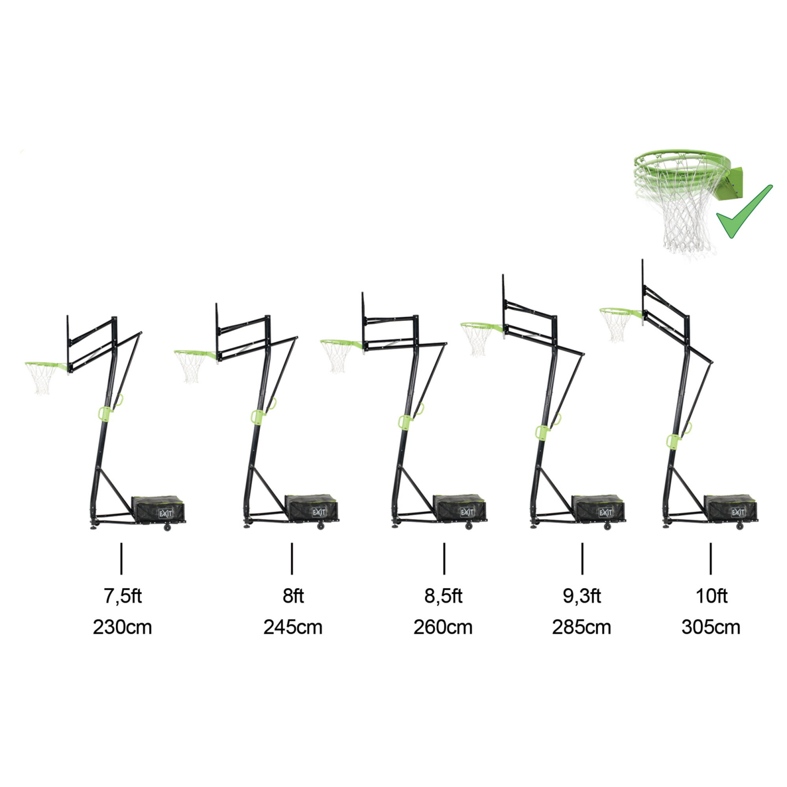Placa de baschet portabilă EXIT Galaxy pe roți cu dunk hoop garantează ore întregi de distracție la baschet. Acest sistem de baschet este echipat cu un cadru unic pe roți, ceea ce facilitează jocul de baschet în orice locație. Dunk hoop-ul care vine cu acesta se mișcă în timpul dunking-ului, astfel încât să poți exersa cele mai tari mișcări de baschet. Cadrul plăcii de baschet portabile Galaxy este un sistem unic pe trei roți robuste și o contragreutate. Acest lucru îți permite să miști cu ușurință placa de baschet fără a înclina cadrul. Roata pivotantă din partea frontală îți permite să direcționezi placa în orice direcție. Cei trei saci de nisip furnizați pentru contragreutate sunt umpluți și împinși prin capac, menținând cadrul ferm în poziția sa. Placa de baschet EXIT Galaxy poate fi ajustată la cinci înălțimi diferite (230 - 245 - 260 - 285 - 305 cm), iar cea mai înaltă poziție este pentru meciurile de baschet pentru seniori. Sistemele de baschet EXIT Toys sunt robuste și fabricate din materiale de înaltă calitate pentru o durată lungă de viață.
