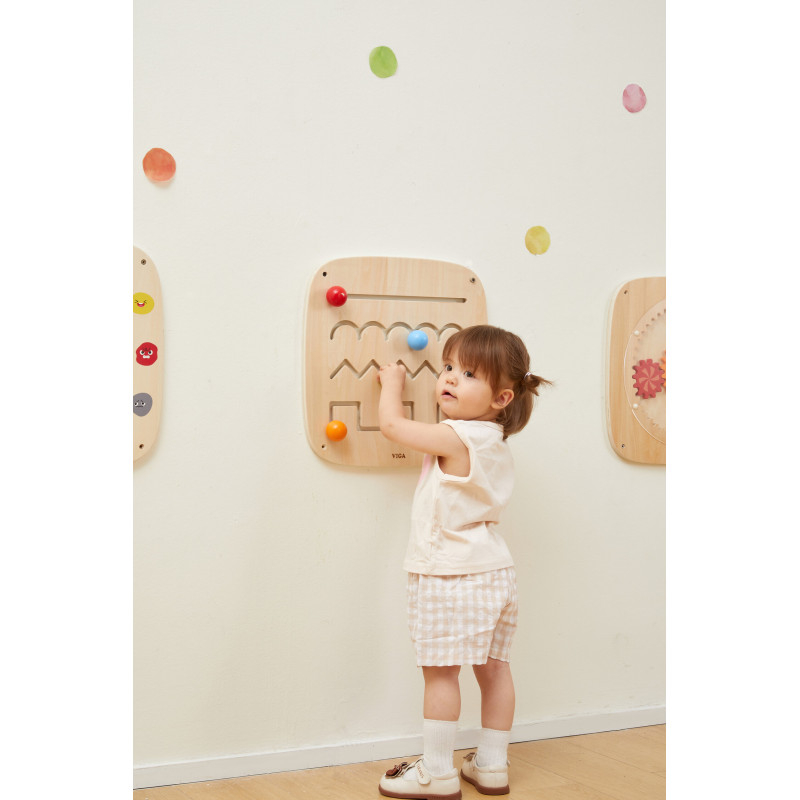 Jucarie Montessori pentru coordonare si pregatire pentru scriere.Acest panou de activitati pentru perete include trasee glisante cu patru tipuri de linii – dreapta, ondulata, zigzag si in trepte – impreuna cu patru bile colorate.• Manerele bilelor sunt usor de prins, special concepute pentru mainile mici.• Copiii descopera caracteristicile liniilor in timp ce deplaseaza bilele pe trasee.• Sustine recunoasterea culorilor, urmarirea vizuala si intelegerea conceptelor precum unghiuri si curbe.• Ajuta la dezvoltarea coordonarii mana-ochi si pregateste copilul pentru scriere.Perfect pentru mamici care cauta jucarii educative Montessori pentru perete, panouri senzoriale si activitati care dezvolta motricitatea fina si abilitatile de pregatire a scrierii, dar si pentru gradinite, crese, sali de asteptare, locuri de joaca. Dimensiuni: 40 × 40× 1,5 cm Varsta recomandata: 12 luni+ Jucarie educativa din lemn, Montessori.   *AVERTISMENT! Toate jucariile marca VIGA sunt fabricate din lemn de calitate cu vopsele si cerneluri non-toxice, supuse testelor de siguranta respectand standardele pentru jucarii ale Uniunii Europene EN71 si ASTM. Nu lasati ambalajul produsului la indemana copiilor. Indepartati orice ambalaj al produsului inainte de a da jucaria copilului. Va recomandam sa supravegheati copilul in timp ce se foloseste produsul. Pastrati instructiunile si etichetele pentru referinte viitoare. Feriti produsul de foc, temperaturi ridicate si umiditate.
