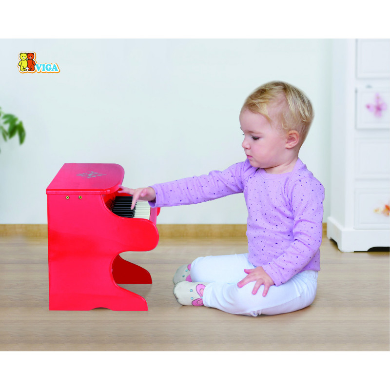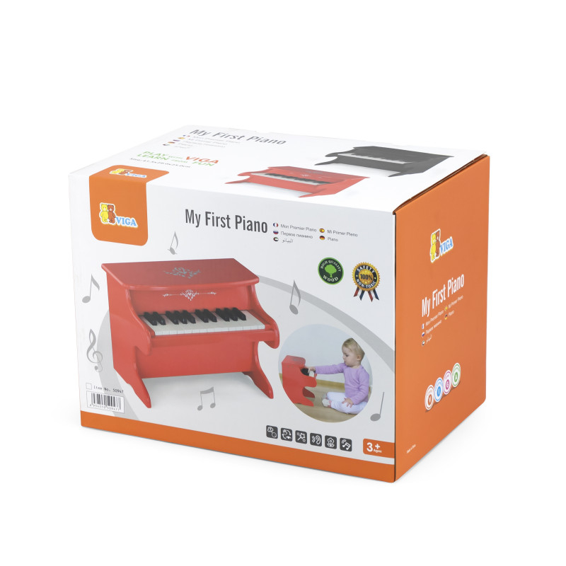 Un instrument muzical minunat, finisat in rosu clasic.   Cultiva interesul copiilor pentru muzica si cantece, stimuleaza coordonarea mana-ochi, exerseaza flexibilitatea degetelor.  Pianul este din lemn de culoare rosie si are 25 de clape cu note muzicale si o carte cu 8 melodii, printre care Twinkle Twinkle Little Star si Scufita Rosie, ce pot fi interpretate la pian, si un card care ajuta la indentificarea notelor muzicale pe baza de culori. Pianul este actionat mecanic, nu contine baterii. Jucarie educativa din lemn, Montessori. Material: lemn   Dimensiuni: 40 x 30 x 25 cm  *AVERTISMENT! Contraindicat copiilor mai mici de 18 luni. Jucaria/produsul poate contine piese mici care se pot inghiti sau inhala existand pericolul de sufocare sau nu este potrivita copiilor mai mici de luni. Toate jucariile marca VIGA sunt fabricate din lemn de calitate cu vopsele si cerneluri non-toxice, supuse testelor de siguranta respectand standardele pentru jucarii ale Uniunii Europene EN71 si ASTM. Nu lasati ambalajul produsului la indemana copiilor. Indepartati orice ambalaj al produsului inainte de a da jucaria copilului. Va recomandam sa supravegheati copilul in timp ce se foloseste produsul. Pastrati instructiunile si etichetele pentru referinte viitoare. Feriti produsul de foc, temperaturi ridicate si umiditate.