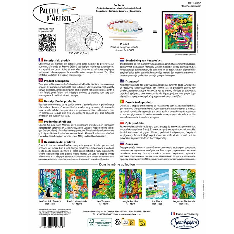 Lasă-te purtat în inima unei piețe mexicane cu această pictură pe numere strălucitoare. Urmează numerele și dezvăluie, pas cu pas, o scenă colorată și exotică. Descoperă pictura Palette d’Artiste – Piața Mexicană și pătrunde în inima orașului plin de culoare San Miguel, din Mexic. Dă viață pânzei tale, dezvăluind cactuși exotici, flori și fructe. Dă frâu liber creativității și lasă-te purtat de culori! Conceput pentru adolescenți și adulți , acest kit oferă o experiență unică de pictură pe numere. Colecția Sentosphere a fost dezvoltată pentru a asigura un proces creativ plăcut și ușor: pânza fină și ușor de manevrat permite o aplicare uniformă a vopselei, fără să se prindă, facilitând trasarea precisă a contururilor. Setul include mai multe pensule adaptate dimensiunii lucrării, împreună cu o paletă de 13 până la 17 culori acrilice atent selecționate. Vei îndrăgi textura lor fluidă și finisajul satinat, care oferă rezultate impecabile și o acoperire perfectă. Vopseaua este pe bază acrilică, realizată din ingrediente bio de origine vegetală europeană, în proporție de 50%. Această compoziție păstrează textura satinată a vopselei, oferind un rezultat luminos și garantând o aplicare non-lipicioasă. Paleta inclusă îți permite să creezi propriile nuanțe pentru un plus de originalitate și o notă personală, oferindu-ți libertatea de a-ți exprima creativitatea. În plus, fișa cu instrucțiuni oferă o versiune mai clară a modelului, cu linii și numere mai evidențiate, pentru a te ghida mai ușor în procesul de colorare. Fabricat în Franța , Palette d’Artiste îmbină calitatea , accesibilitatea și distracția pentru oricine dorește să evadeze prin pictură. Eliberează-ți mintea și lasă-te ghidat de numere și culori pe tot parcursul lucrării. Lasă-te purtat de peisajele și modelele deosebite și trăiește o experiență artistică unică! Conține: 1 tablou canvas ilustrat și numerotat (25 x 32,5 x 1,8 cm) Minimum 13 culori de vopsele acrilice non-toxice Pensule de înaltă calitate 1 paletă pentru amestecul culorilor 1 set de instrucțiuni multilingve despre percepția culorilor Vârsta recomandata : 8 ani + Dimensiuni cutie: 34 x 25,5 x 3 cm Materiale: carton si plastic, reciclate Brand: SENTOSPHERE Beneficiile picturii pe numere: Reduce stresul și anxietatea Îmbunătățește concentrarea și dezvoltă răbdarea Stimulează creativitatea Dezvoltă abilitățile motorii fine Favorizează relaxarea și buna dispoziție Crește sentimentul de realizare personală. O terapie relaxantă Cu culori vii și o aplicare fluidă, fiecare mișcare a pensulei devine un moment de plăcere și satisfacție. Numerele și culorile îți vor elibera mintea de orice grijă și îți vor permite să te bucuri pe deplin de acest moment creativ. Un produs ECO-conceput Această gamă este produsă în Franța și a fost dezvoltată într-o logică de eco-conceptie, pentru a oferi un moment creativ si relaxant respectând cat mai bine planeta și generațiile viitoare. Fiecare material a fost ales cu atenție după cum urmează: Bază acrilică realizată cu 50% ingrediente bio-sursă Sticle și capace realizate din 50% PET reciclat Paletă realizată din 70% material reciclat Cutie realizată din 100% carton reciclat certificat FSC Avertisment: Jucărie testată în laborator, care garantează conformitatea cu Directiva 2009/48/CE pentru un copil de peste 8 ani. ATENTIE! Nu este potrivită pentru copiii sub 3 ani. Elemente mici. Pericol de sufocare.