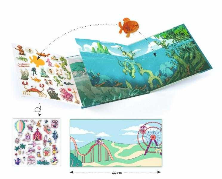 Varsta recomandata: +4 ani. Setul contine 2 planse panoramice|preilustrate si 2 coli cu aprox. 50 stickere reutilizabile. Stickerele individuale se pot pozitiona nelimitat in diferite moduri pe planse|astfel ca este un set numai bun de avut mereu la indemana. Cutia se poate folosi ca suport pentru plansele panoramice atunci cand copilul se joaca pe plaja|in masina..sau oriunde are chef! Confectionat din  materiale non-toxice|cu vopsele non-toxice|conform reglementarilor EN71 ;ASTM. AVERTISMENT: Contraindicat copiilor sub 3 ani. Contine parti mici. Se recomanda supravegherea copilului de catre un adult in timpul jocului. Cititi cu atentie eticheta produsului inainte de a inmana jucaria copilului. €‹Producator: Djeco|Franta
