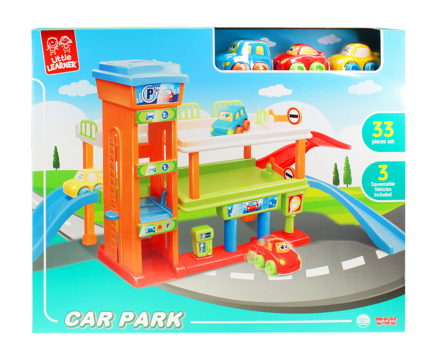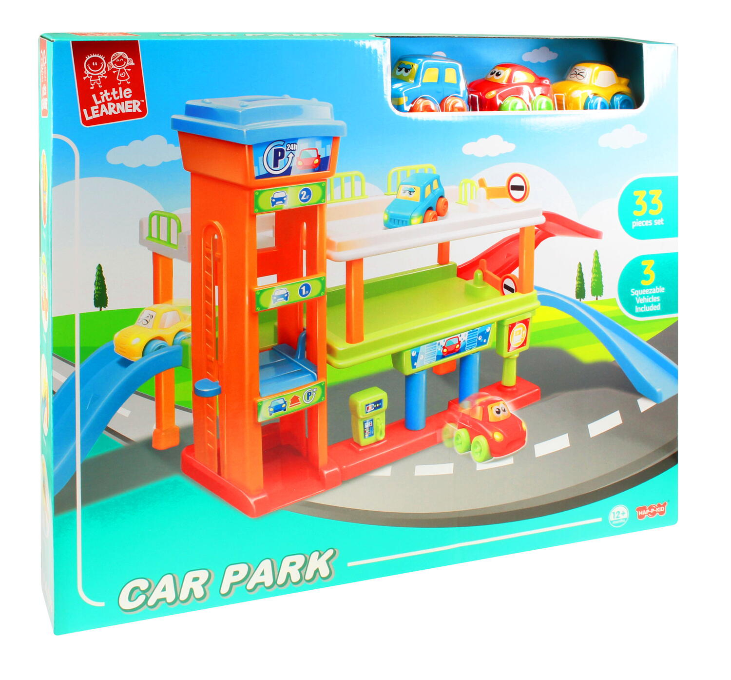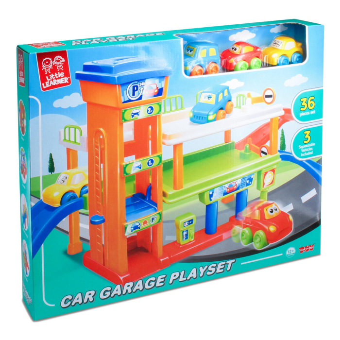 Setul include 33 piese: 3 masinute, rampe, parcari supraetajate, benzinarie, spalatorie auto etc.