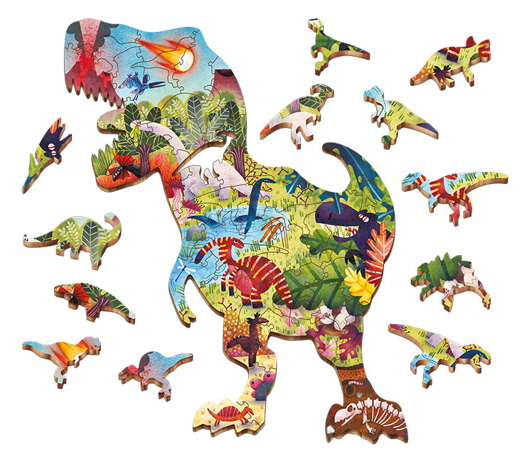Un puzzle cu piese din lemn, cu o formă deosebită și un peisaj ilustrat. Printre piesele care alcătuiesc puzzle-ul găsiți 12 forme de animale care trebuie plasate fiecare pe suportul său .