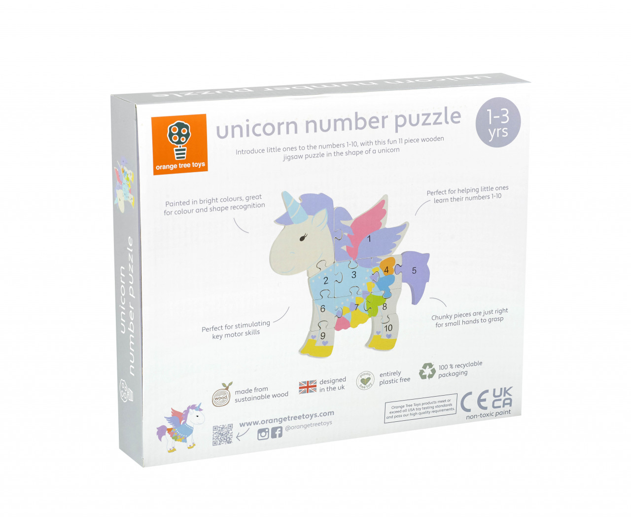 Puzzle din lemn unicorn cu cifre Puzzle numeric din lemn, in forma de unicorn inaripat, cu 11 piese, pentru a-i familiariza pe cei mici cu numerele 1- 10. Piesele sale groase sunt potrivite pentru a fi prinse de manutele mici. Dimensiune puzzle 23 x 24 cm. Varsta recomandata: +18 luni. Confectionat din lemn FSC®, cu vopsele pe baza de apa. Conform reglementarilor EN71&ASTM. A se folosi sub directa supraveghere a unei persoane adulte. Produs in China pentru Orange Tree Toys, Anglia.