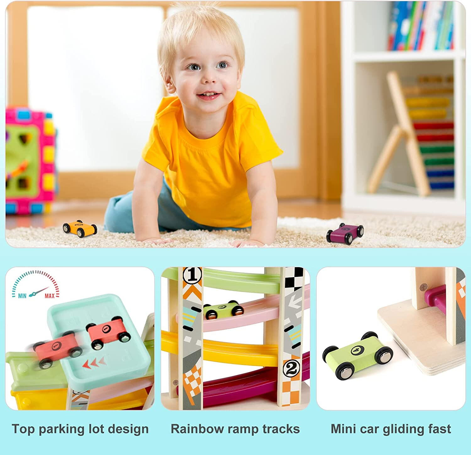Aceste masinute de curse se deplaseaza in jos pe rampa cu o viteza uluitoare si efectueaza salturi de la un nivel la altul.
