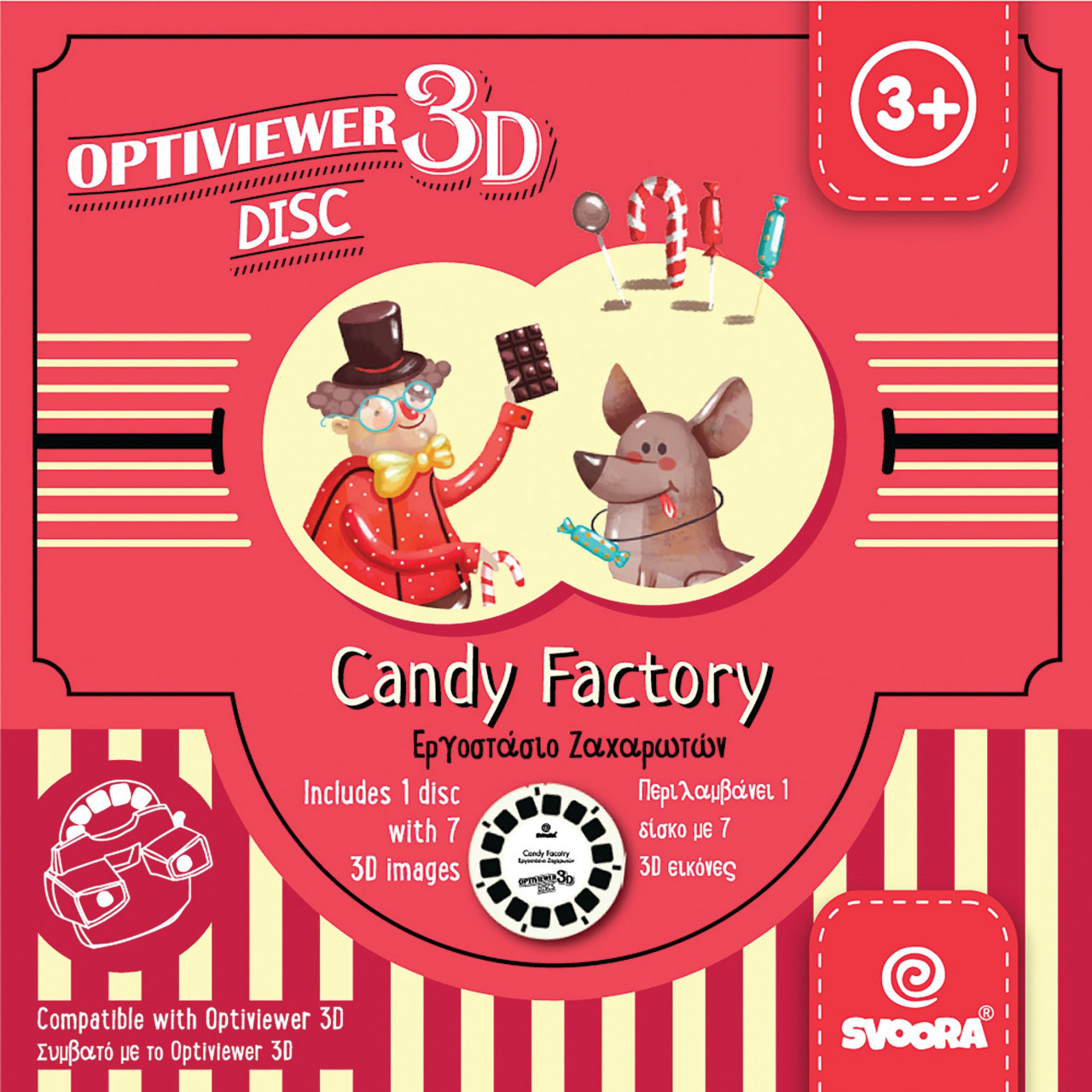ROLA OPTIVIEWER 3D "FABRICA DE BOMBOANE" Haideți să explorăm o poveste uimitoare "Fabrica de bomboane"! 7 imagini 3D impresionante vin să extindă distracția 3D Optiviewer! Descrierea conținutului imaginilor poate da startul multor povești diferite care sporesc imaginația, dezvoltă observația, lărgesc creativitatea si ajută copilul să rămână concentrat pe un anumit subiect! Fiecare pachet de bobine include o mică broșură cu toate imaginile care pot fi explorate de părinți si copii simultan, sporind legătura dintre ei! Sunt disponibile 3 povești diferite compatibile cu 3D Optiviewer (#03005) și cu proiectoare similare. Introduceți discul, apoi apăsați maneta. În interiorul acestui dispozitiv de epocă, descoperiți o lume magică 3D. Imaginile sunt clare, fiind compuse din fotografii suprapuse care redau real obiectele. Vârsta recomandată: +3 ani. Confecţionată din carton și nylon. Conform reglementarilor EN71&ASTM. AVERTISMENT! A se folosi sub directa supraveghere a unei persoane adulte. Citiţi cu atenţie eticheta înainte de a înmâna jucăria copilului. Producător: Svoora, Grecia.