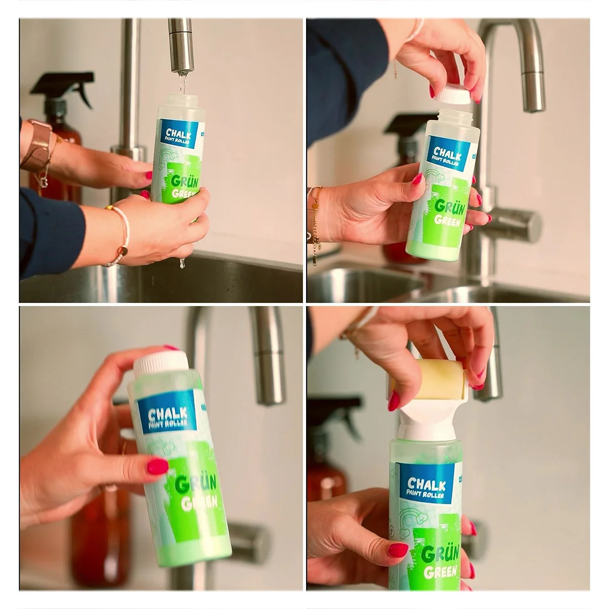 Folosirea este extrem de simplă: adaugă apă până la nivelul indicat, agită bine și începe să desenezi. Rolele din spumă asigură o aplicare uniformă a culorii, pentru rezultate spectaculoase fără efort. Fiecare rolă conține cretă pudră care poate fi reactivată prin adăugarea de apă, ceea ce face produsul reutilizabil.