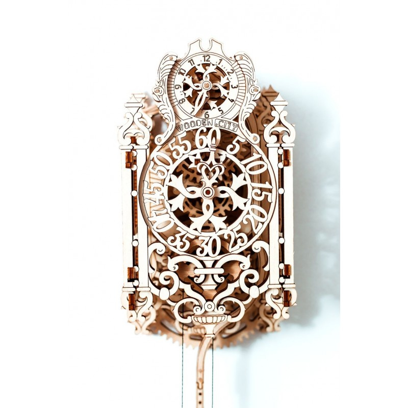 Ceasul nostru regal este un puzzle 3D din lemn de complexitate avansata. Are doua cadrane: unul mic, pentru ore, in partea de sus si unul mare pentru minute, in mijlocul modelului. Trecerea timpului depinde de numarul de monede pe care le puneti in locul special care serveste drept bobul pendulului. Deoarece greutatea in plus schimba centrul de greutate al pendulului si cantitatea de frecare care actioneaza asupra acestuia, cu cat mai multe monede pe care le introduceti, cu atat mai lunga va fi durata unei batai (si functionarea mai lenta). Puteti sa trageti ceasul fabulos tragand lantul in jos, la fel cum ati face cu un ceas adevarat cu cuc. Ceasul functioneaza timp de 12 ore. Numar de piese: 156 Timp de asamblare: 7 ore Dimensiunea modelului: 875 x 110 x 105 mm Marimea ambalajului: 355 × 240 × 40 mm Greutatea pachetului: 1 kg