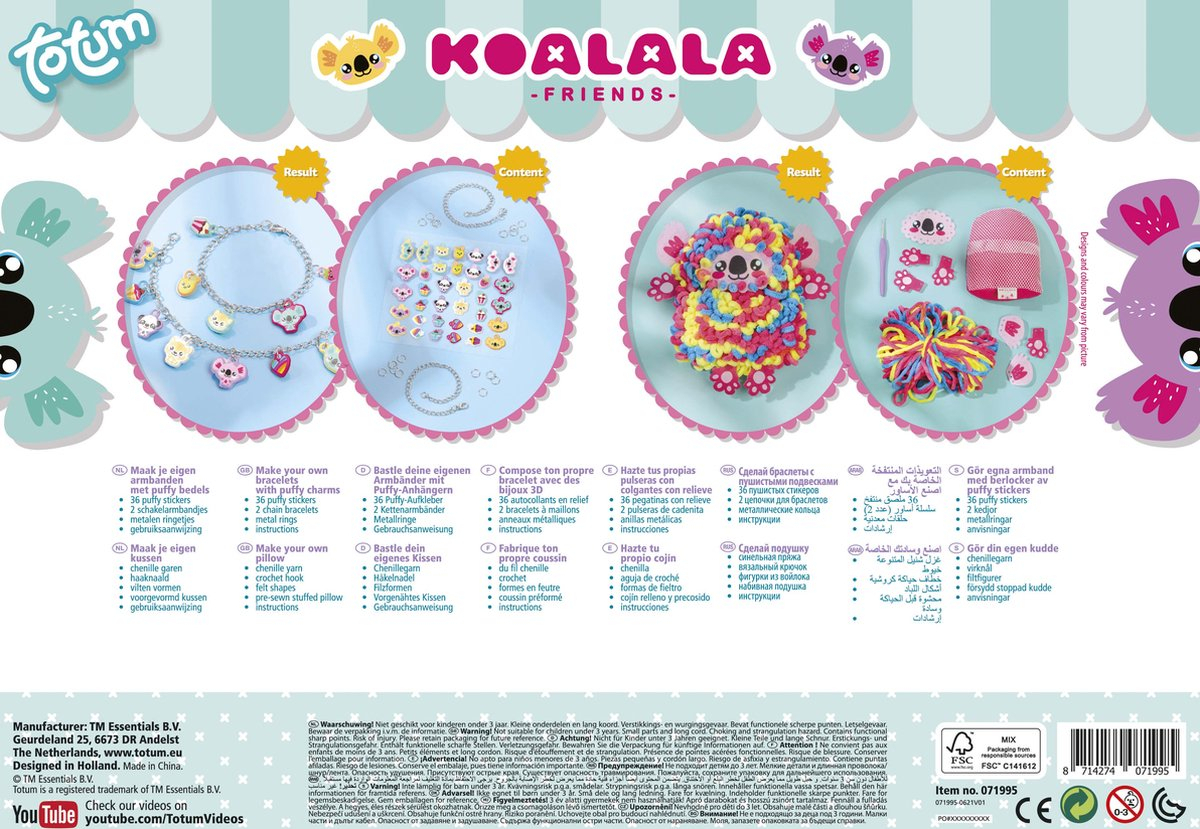 Un set creativ 2 in 1 cu ajutorul caruia iti poti crea cele mai cool bratari si cea mai simpatica pernuta sub forma unui ursulet Koala. Include: 36 de abtibilduri moi, 2 bratari cu lant, inchizatori metalice, fire de tricotat plusat Chenille, croseta, sabloane din fetru, pernuta, instructiuni.